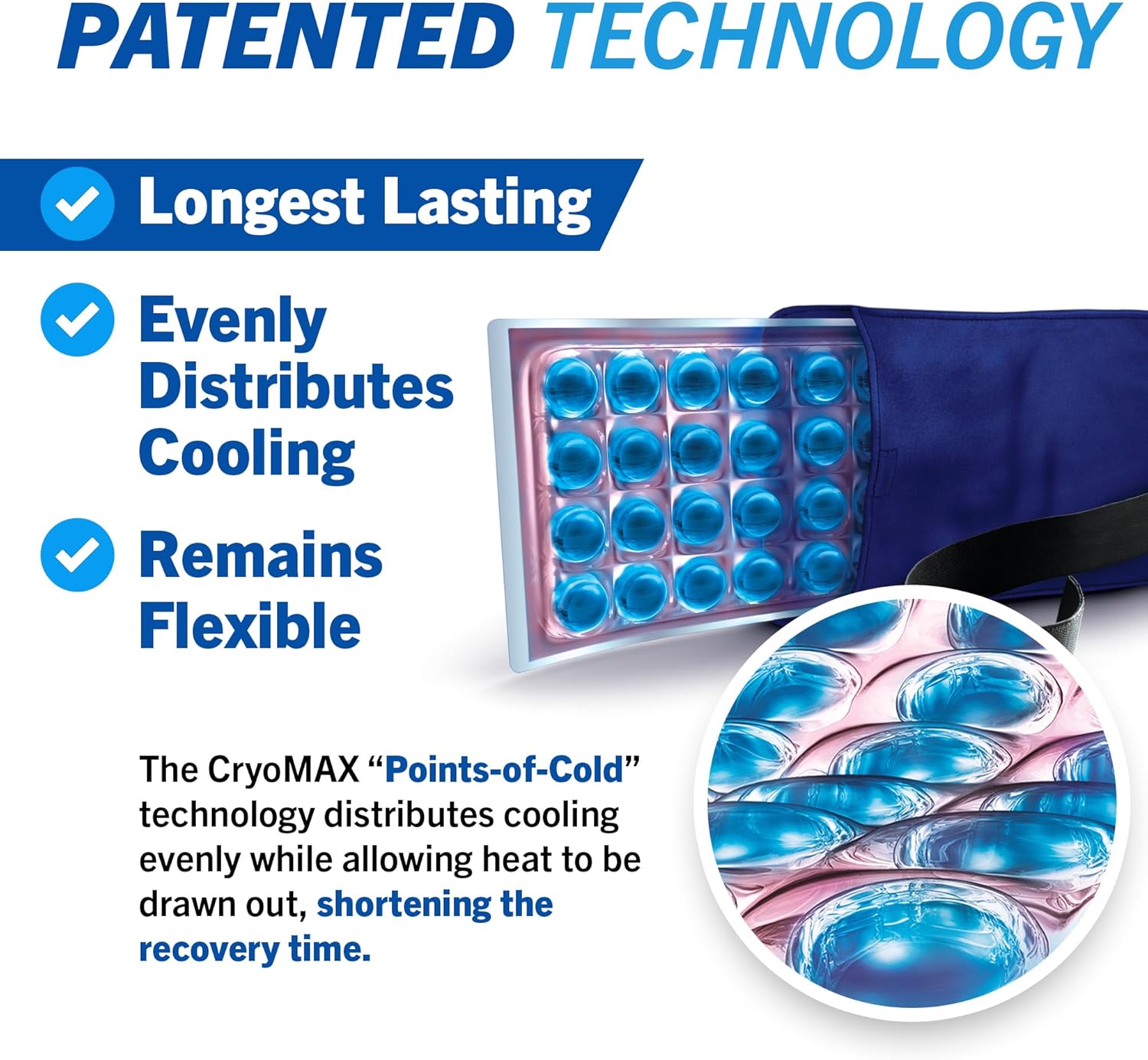 - ULTRA LONG LASTING- CryoMAX uses patented Points-of-Cold technology to stay cold for up to 8 hours! No need to return to the freezer repeatedly. Other cold packs can't keep up!