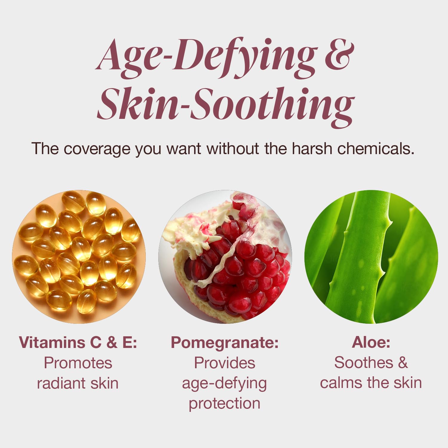 • NATURAL FORMULA: Our age-defying, skin-soothing pressed powder is made with Pomegranate, White Tea, Red Tea, and Sea Kelp to illuminate your natural glow while reducing the appearance of free radical damage. Has buildable coverage for total flexibility