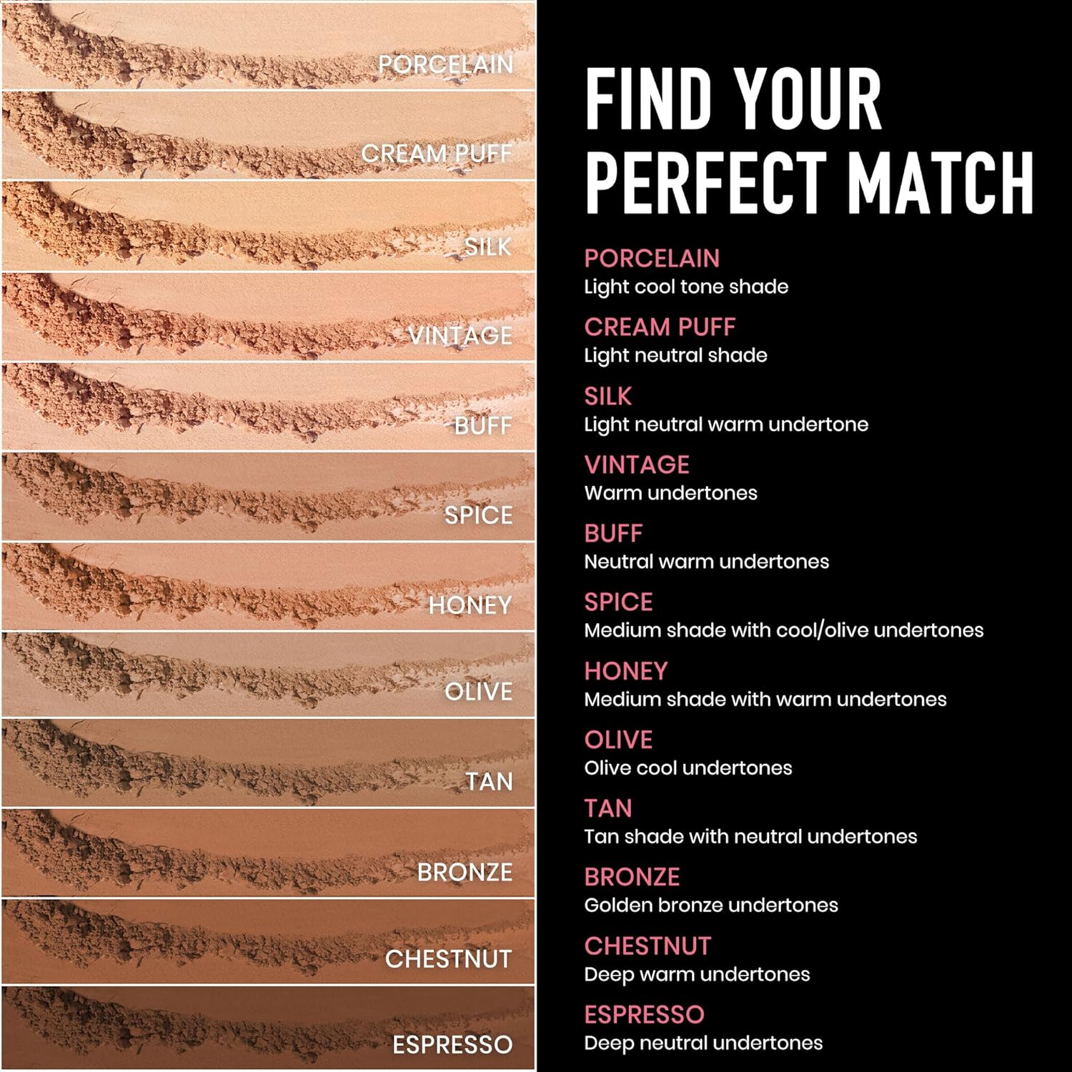 • PERFECT MATCH FOR EVERY SKIN TONE: Frankie Cosmetics Compact Powder is available in 12 drop-dead gorgeous shades so that you can find a perfect match for your skin tone: Cream Puff, Porcelain, Silk, Vintage, Buff, Spice, Honey, Olive, Tan, Bronze, Chestnut, and Espresso.