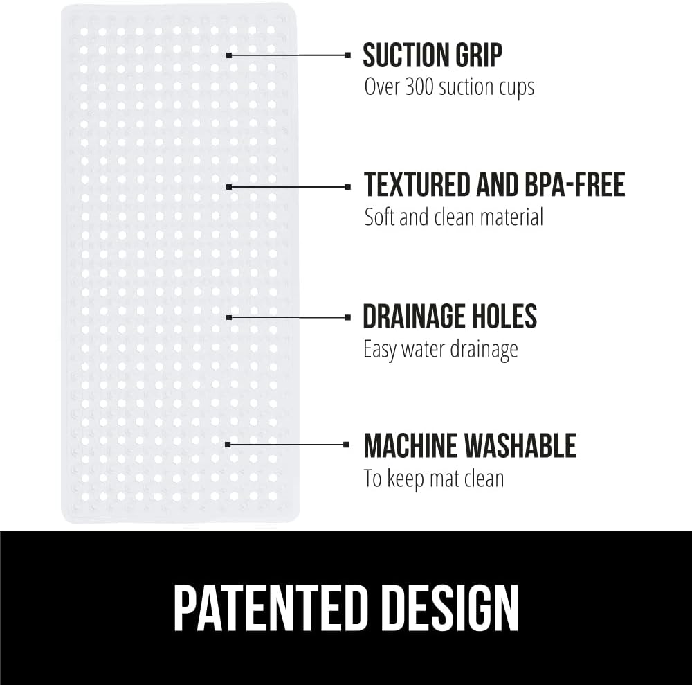 - PATENTED DESIGN WITH POWERFUL SUCTION GRIP: a bath mat designed to securely stay in place; this patented bathtub mat features hundreds of suction cups that effectively help secure the tub mat to your shower floor