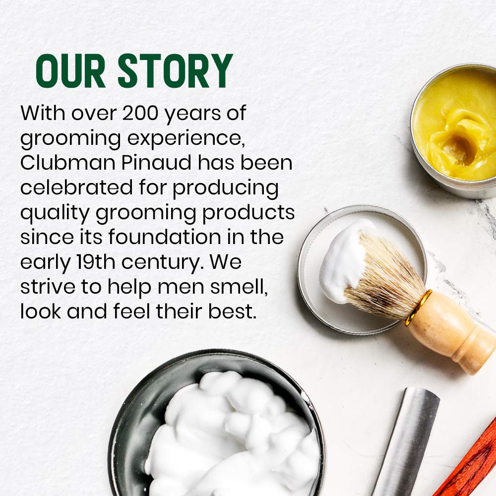 - CRUELTY-FREE, MADE IN THE US, TRUSTED FOR GENERATIONS: With over 200 years of grooming experience, Clubman Pinaud is a trusted brand. Clubman has been celebrated for producing quality products since its foundation in the early 1800s. Men have been using their products for generations, while younger users are turning to their products for trusted grooming solutions with a sense of nostalgia, proving quality never goes out of style. Completely cruelty-free, proudly made in the USA.