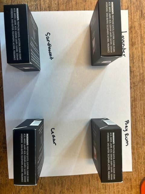 - PACKAGING- G.B.S 4 Men’s Shaving Soap in a package is in a package, 1 Sandalwood Shaving Soap, 1 Bay Rum Shaving Soap, 1 Cedar and Pine Shave Soap and 1 Lavender and Citrus Shave Soap