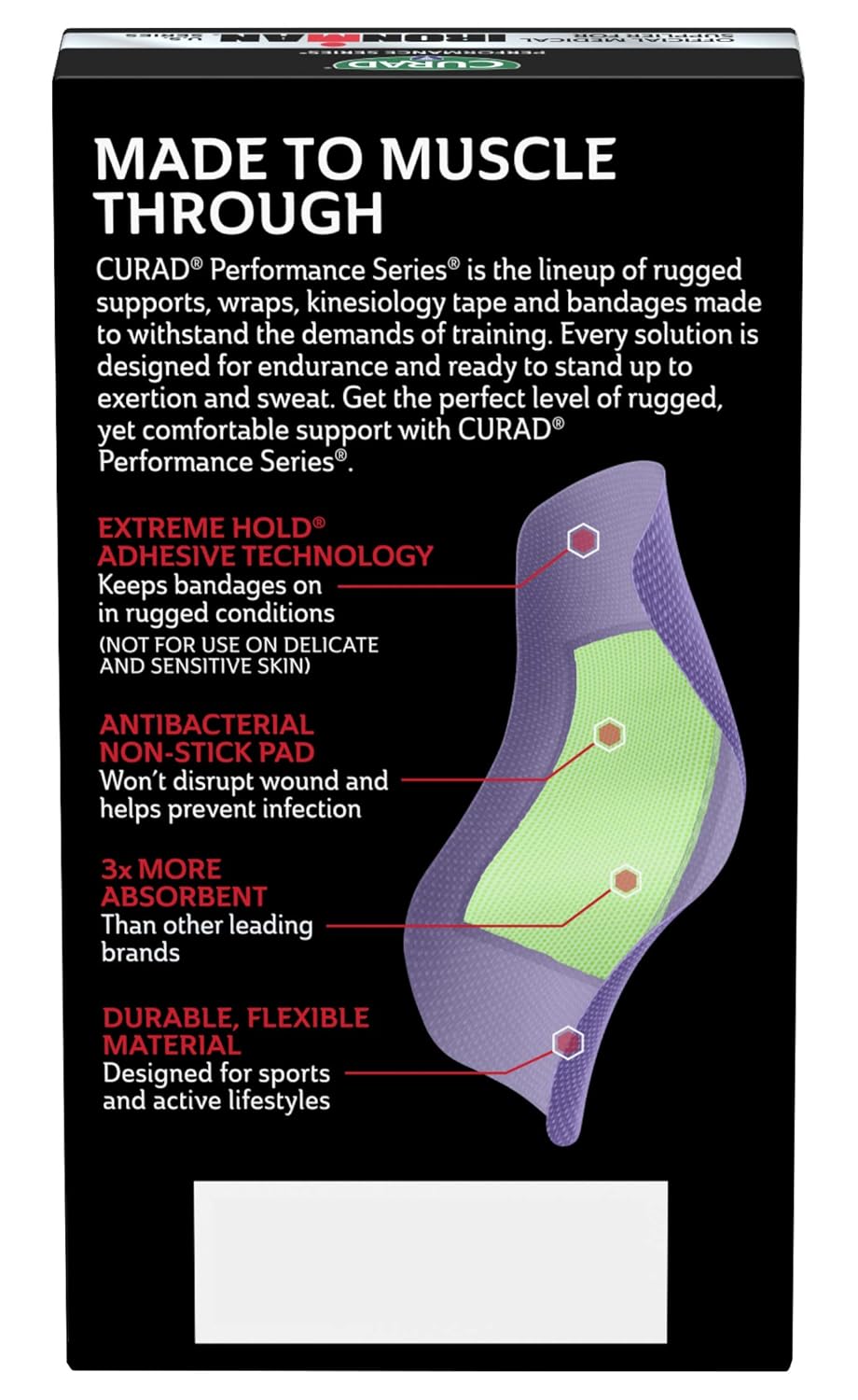 CURAD Performance Series IRONMAN Antibacterial Bandages, Extreme Hold Adhesive Technology, Extra Large Flexible Fabric Bandages for Cuts, Scrapes, & Burns, Assorted Colors, 2 x 4 inches, Pack of 3