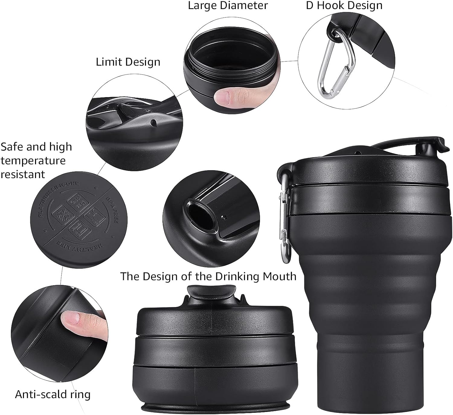 - [Safe Material Food Grade Silicone]- Our collapsible travel cup made of food grades silicone, No BPA. It added a anti-scald ring for safety. Besides. It is easy to clean, non-toxic, odorless, non-staining, durable, flexible & reusable, withstands temperature of -104β ~ 428β. Safe and healthy for the whole family. It`s safer and larger than similar products in the market.