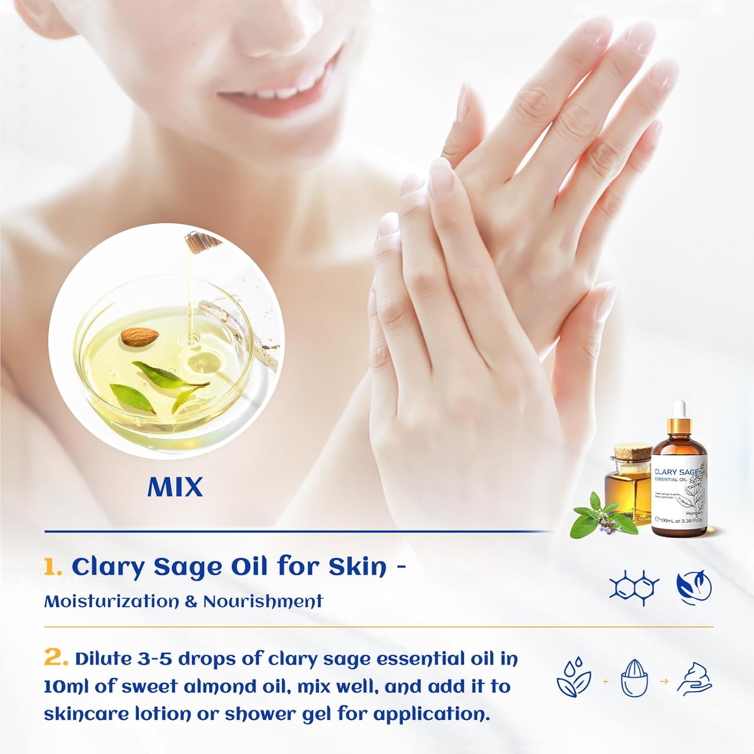 HIQILI Clary Sage Oil Essential, Herbal Sooth Aroma in Diffuse, Meditation, Calming Sleep at Bedtime, Body Massage, Moisturize Skin, DIY Deodorant Spray - 100ML
