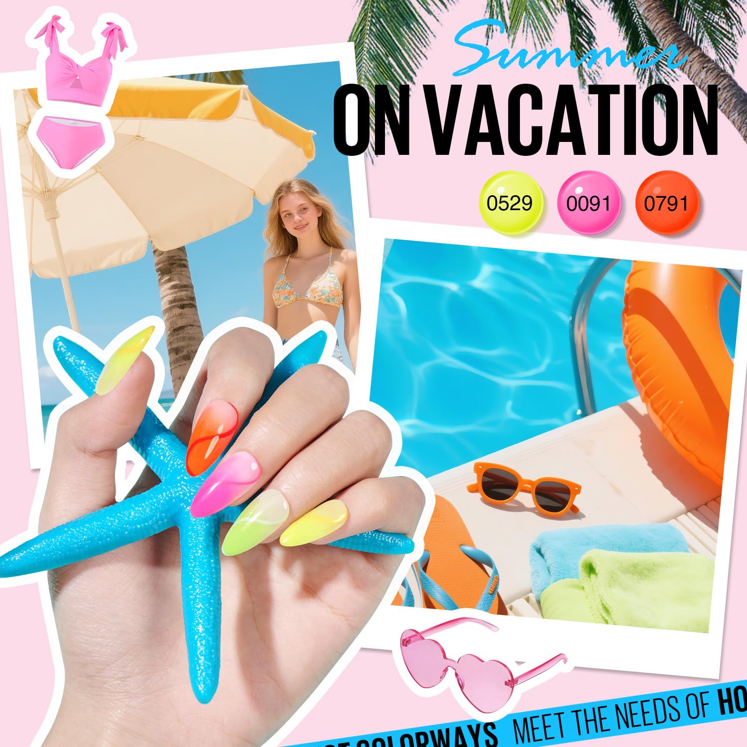 - Summer Neon Gel Nail Polish Set๏ผ6 most iconic and trendsetting neon colors, orange, pink, blue, yellow, green, purple, neon means bright and bold; make your life sparkle with neon gel polish