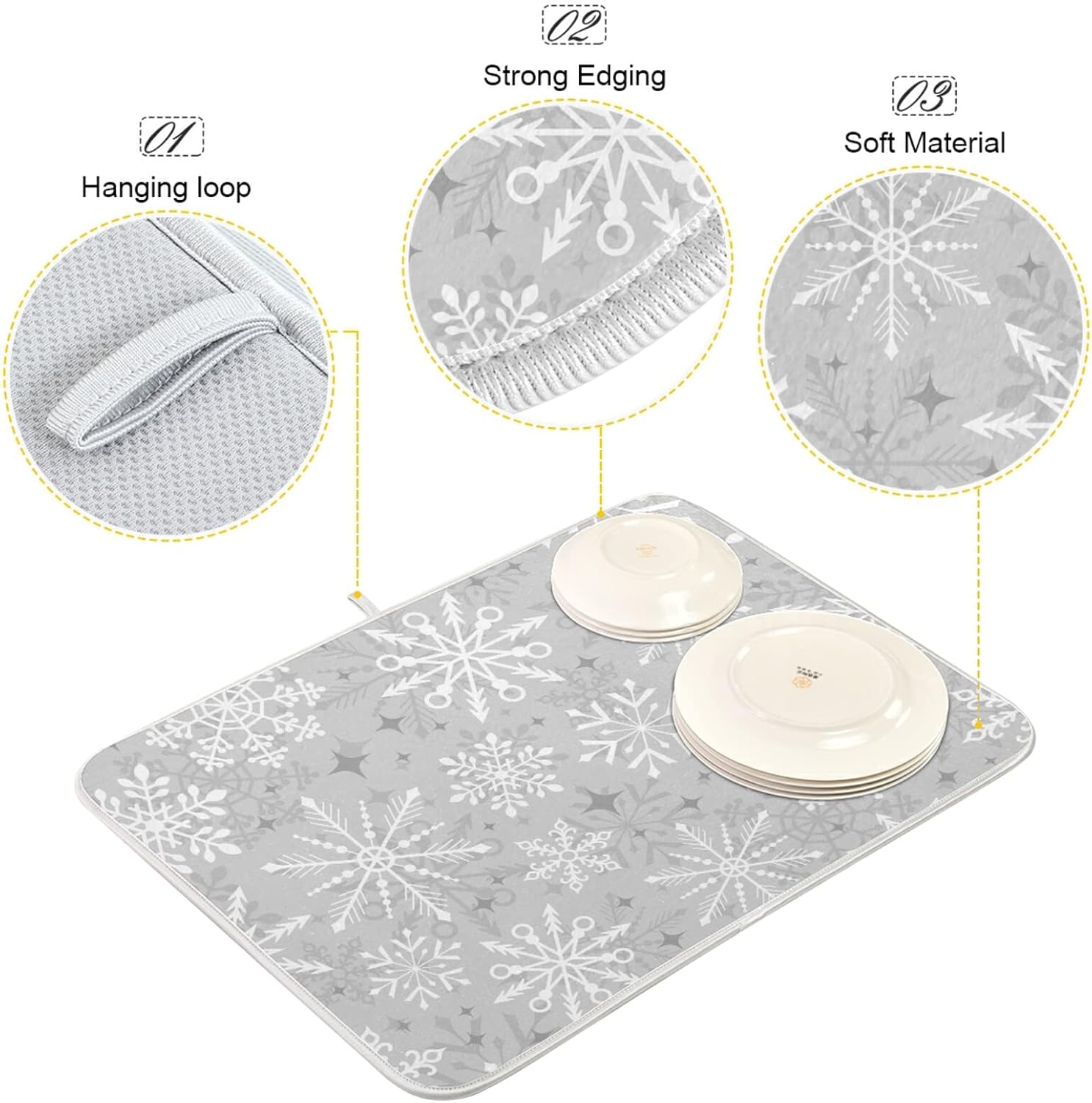Dish Drying Mat for Kitchen Counter 18 x 16 Inch Christmas Silver Snowflake Microfiber Dish Mat Drying Pad Absorbent Dishes Pad Dish Drainer Rack Mats