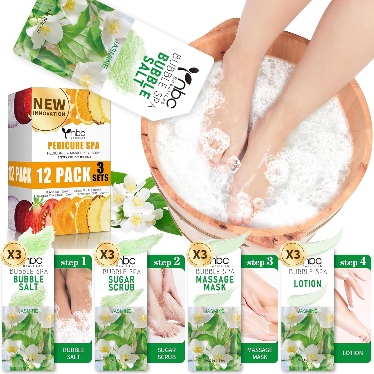 - π[Package Includes]: Exfoliating Foot Spa Pedicure Kit consists of 3* Bubble Salt, 3*Sugar Scrub, 3*Massage Mask, and 3*Massage Lotion for a 4-step foot spa at home. Formated to be gentle on the skin, you are sure to feel your skin feeling soft and supple after use.