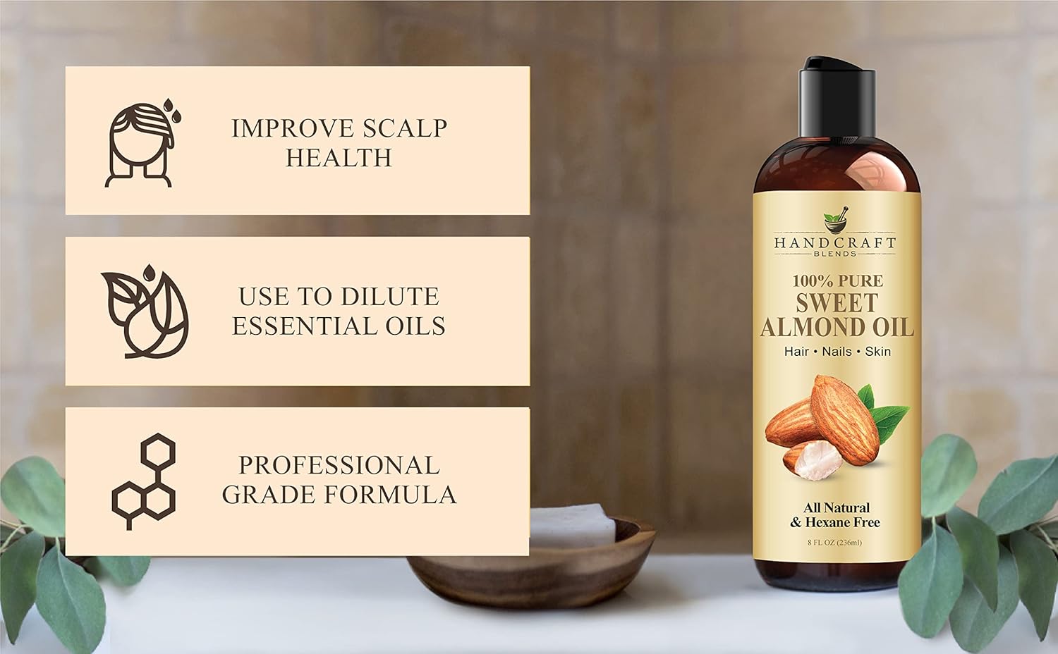 Handcraft Blends Sweet Almond Oil - 8 Fl Oz - 100% Pure and Natural - Premium Grade Carrier Oil for Skin and Hair - Hair and Body - Massage - Hexane-Free