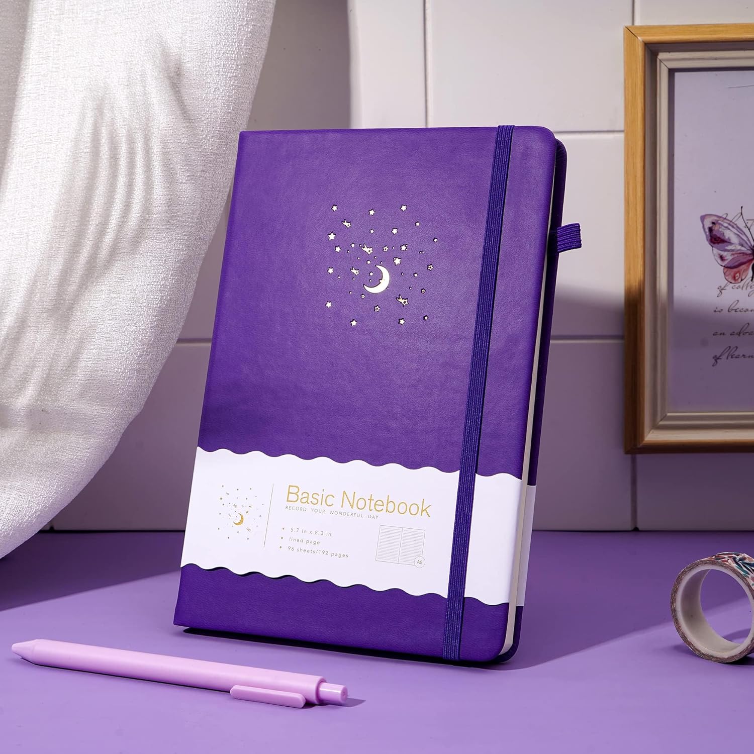 - ✒️ COVERS DESIGN - A5 notebooks for work with gorgeous gold foiling pattern - moon, stars and meteor. Exquisite lined journal is the best decoration for the desk. The journal notebook cover is made of cloth, Elastic banded, Satin ribbon bookmark, Pen loop.