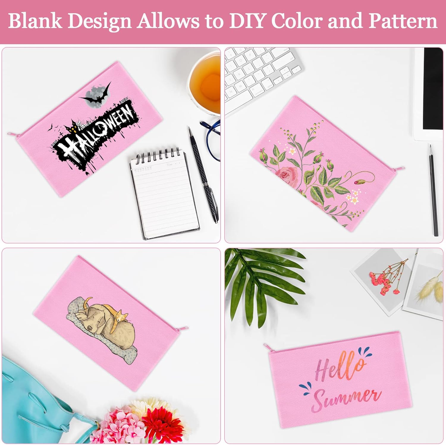 12 Pieces Cotton Canvas Makeup Bag, Multipurpose Cosmetic Bag with Zipper Travel Toiletry Pouch, Blank DIY Craft Bag (Pink, M)