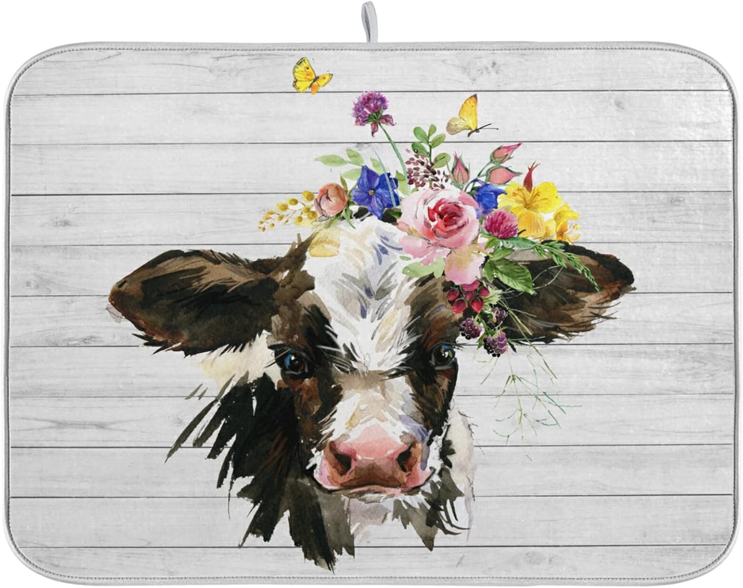 Farmhouse Cow Wood Dish Drying Mat for Kitchen 18x24 inch - Absorbent Microfiber Drainer Rack Fast Dry for Kitchen Counter