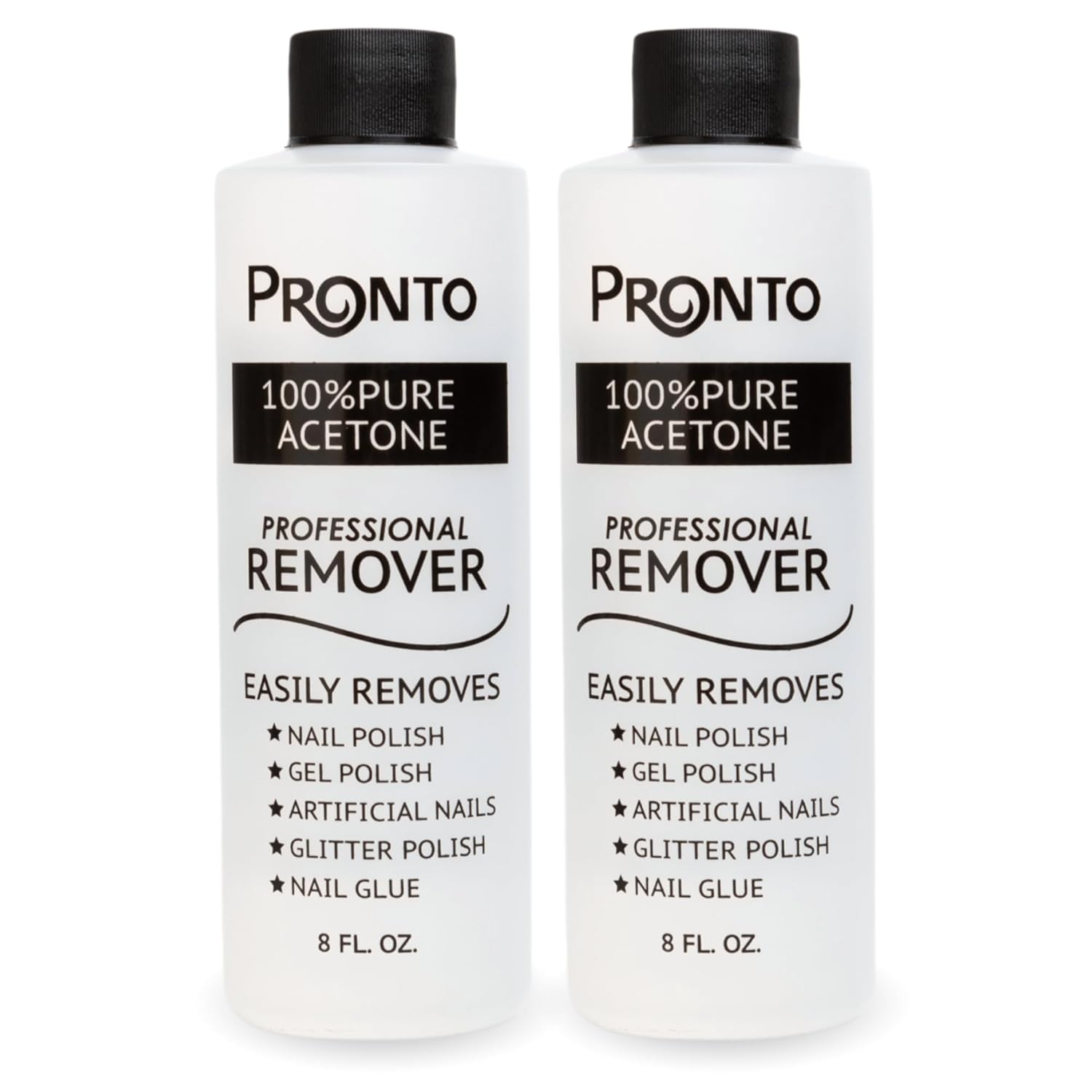 - THE ONLY ONE YOU NEED: Pronto Pure Acetone easily removes nail polish, gel or shellac polish, sculptured nail forms and nail art, artificial nails, glitter polish or nail glue. You can use our professional acrylic nail remover straight from our bottle or from an acetone dispenser.