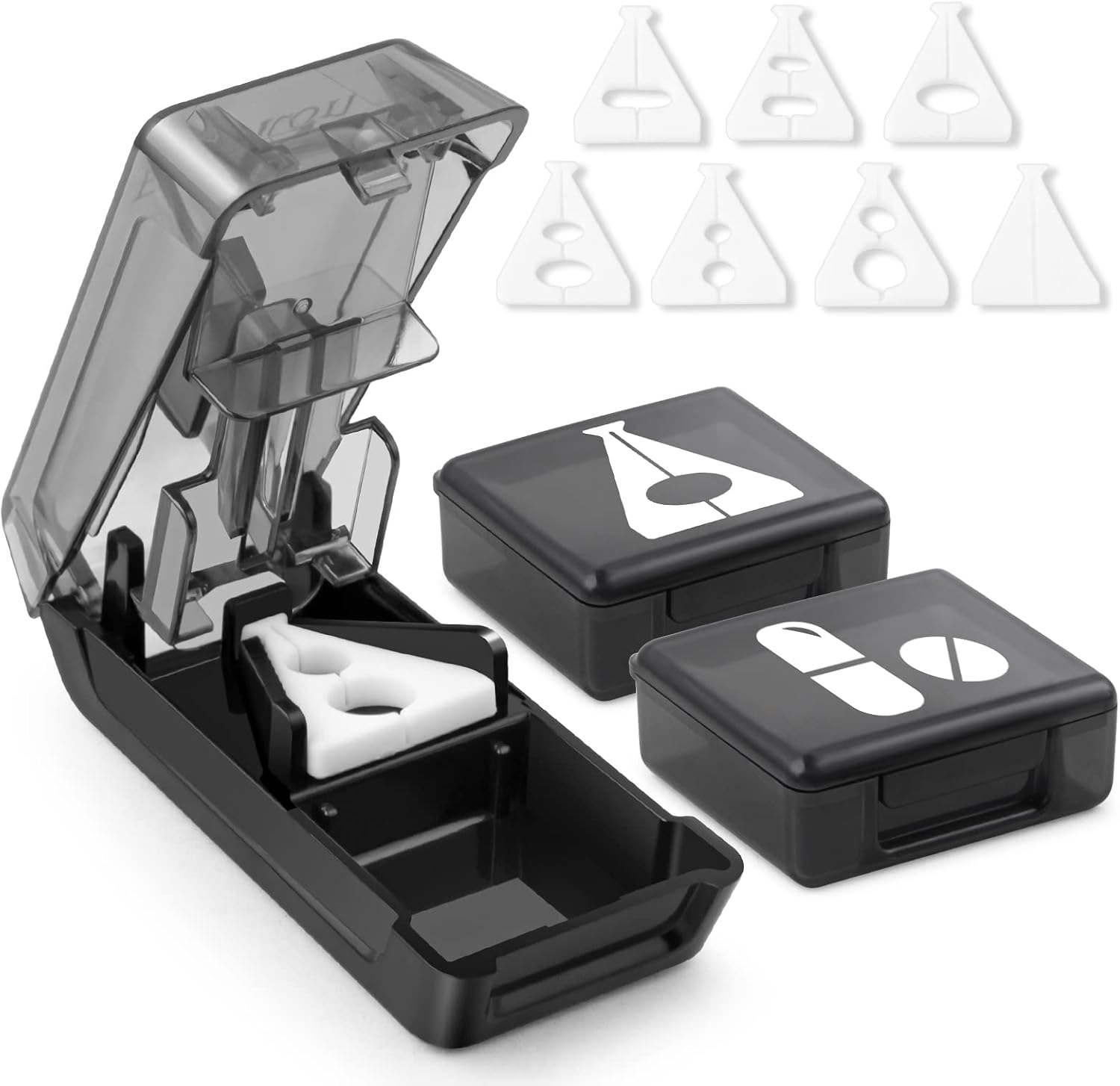 Fullicon Pill Cutter for Small or Large Pills, Pill Splitter with V-Shape Holder, Medicine Slicer with Sharp Blade,Tablet Splitter with Two Large Pill Organizers-Black