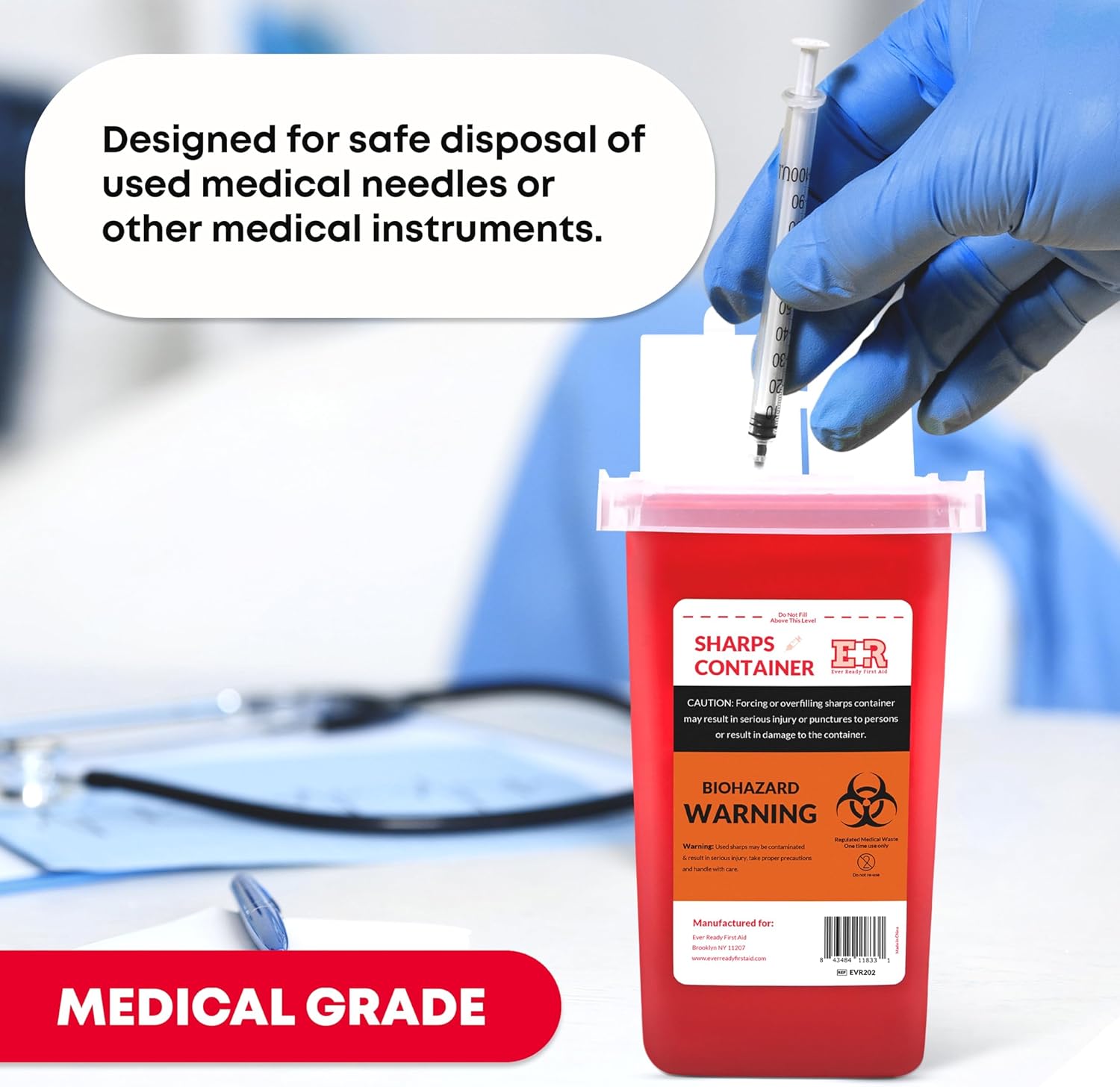 Ever Ready First Aid Sharps Container with Split Lid Design and Locking Mechanism for Sharp Waste Disposal, 1 Quart