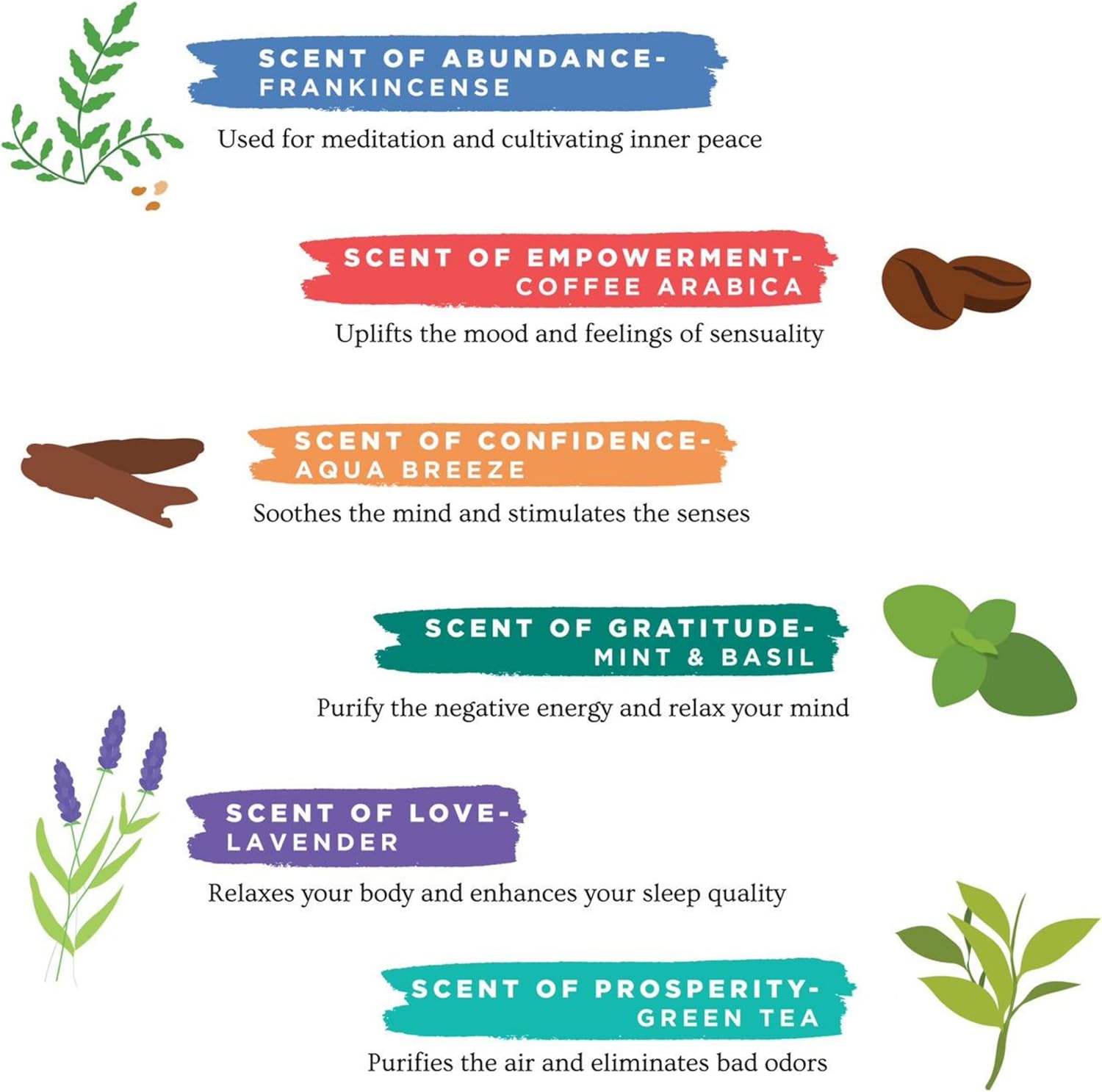 - Fragrance Notes β This incense pack combines uplifting earthy notes with floral undertones with fragrances like Frankincense insense, Coffee inscents, Aqua Breeze, Mint and Basil, Lavender insences, Green Tea Inscents-Sticks. Suitable for meditation rooms, bedrooms, living areas, and even office spaces.