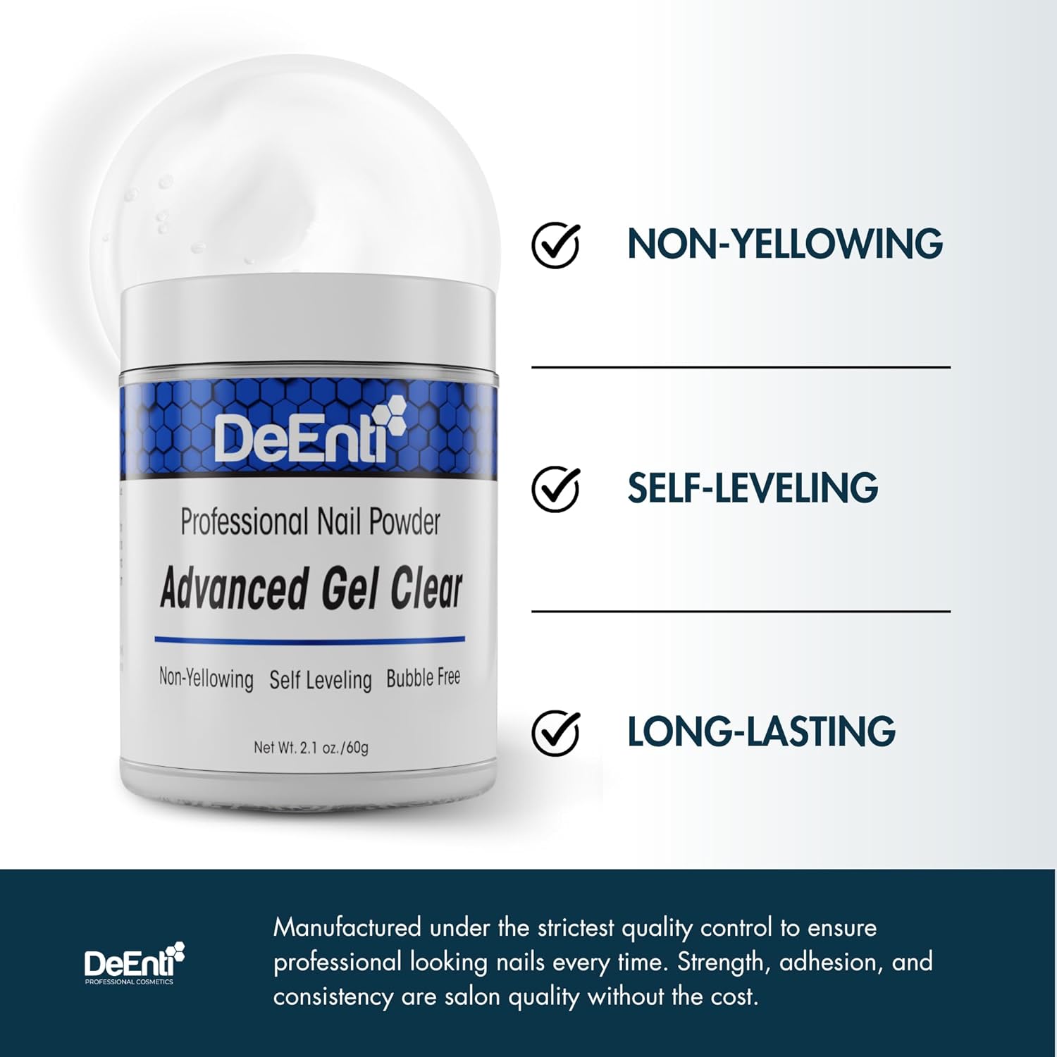 - NON-YELLOWING & SELF LEVELING formula creates smooth, shiny nails without excessive filing and prep. Manufactured under the strictest quality control to ensure professional looking nails every time. Strength, adhesion, and consistency are salon quality without the cost.