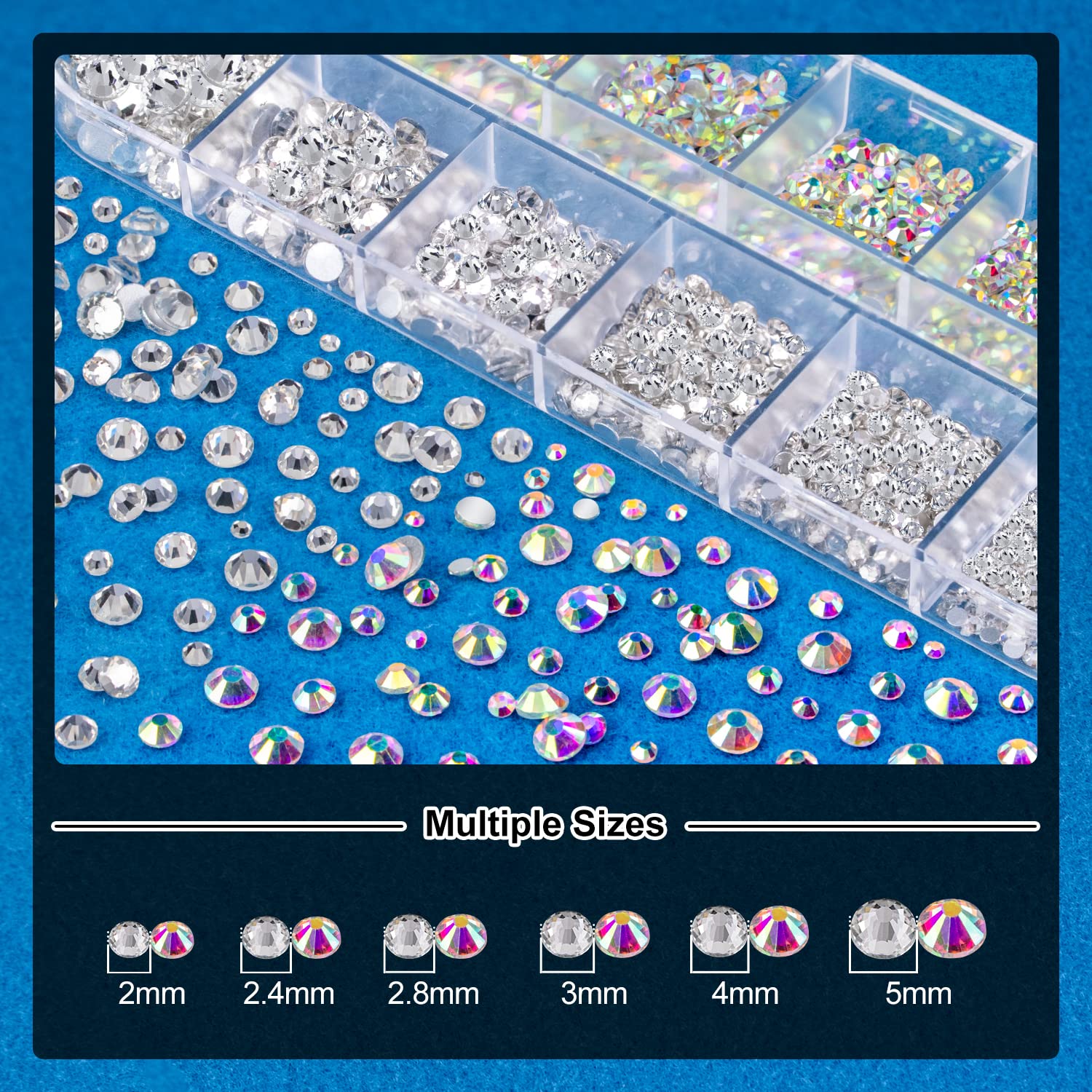 - 💎COMBINATION&MULTIPLE SIZES: This set provides 1 box of Flat-back glass round AB&clear rhinestones with 6 sizes: 2mm、2.4mm、2.8mm、3mm、4mm、5mm; 1 box of Flat-back white&beige half round pearls with 6 sizes: 2mm, 2.5mm, 3mm, 4mm, 5mm, 6mm. Great size range and combination with rhinestones and pearls for your nail art decoration!