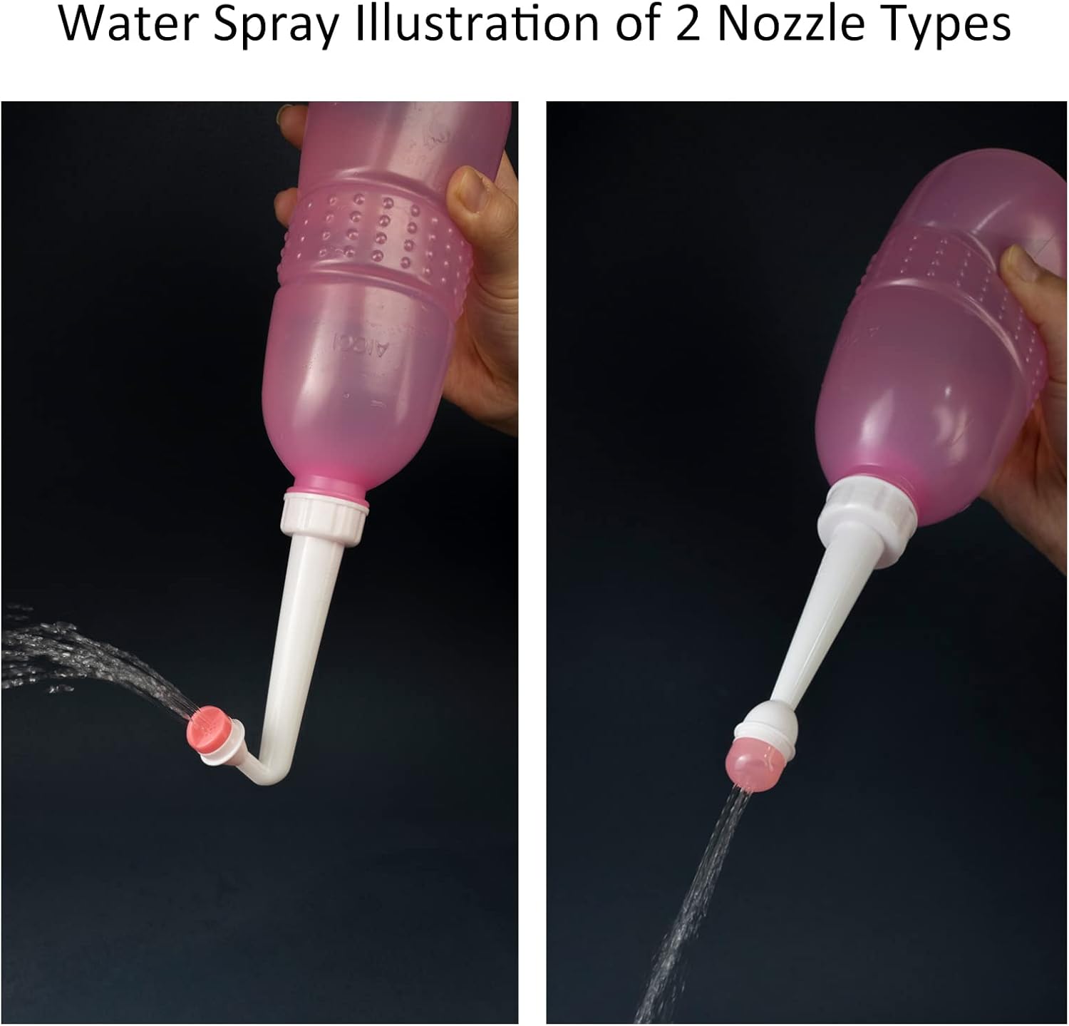 - Waterproof Travel Bag & Dustproof Nozzle Cap Included - Convenient for storage and also a portable bidet for travel. Please separate the bottle and spraying nozzle before storage. Comes with pink or green travel bag randomly.