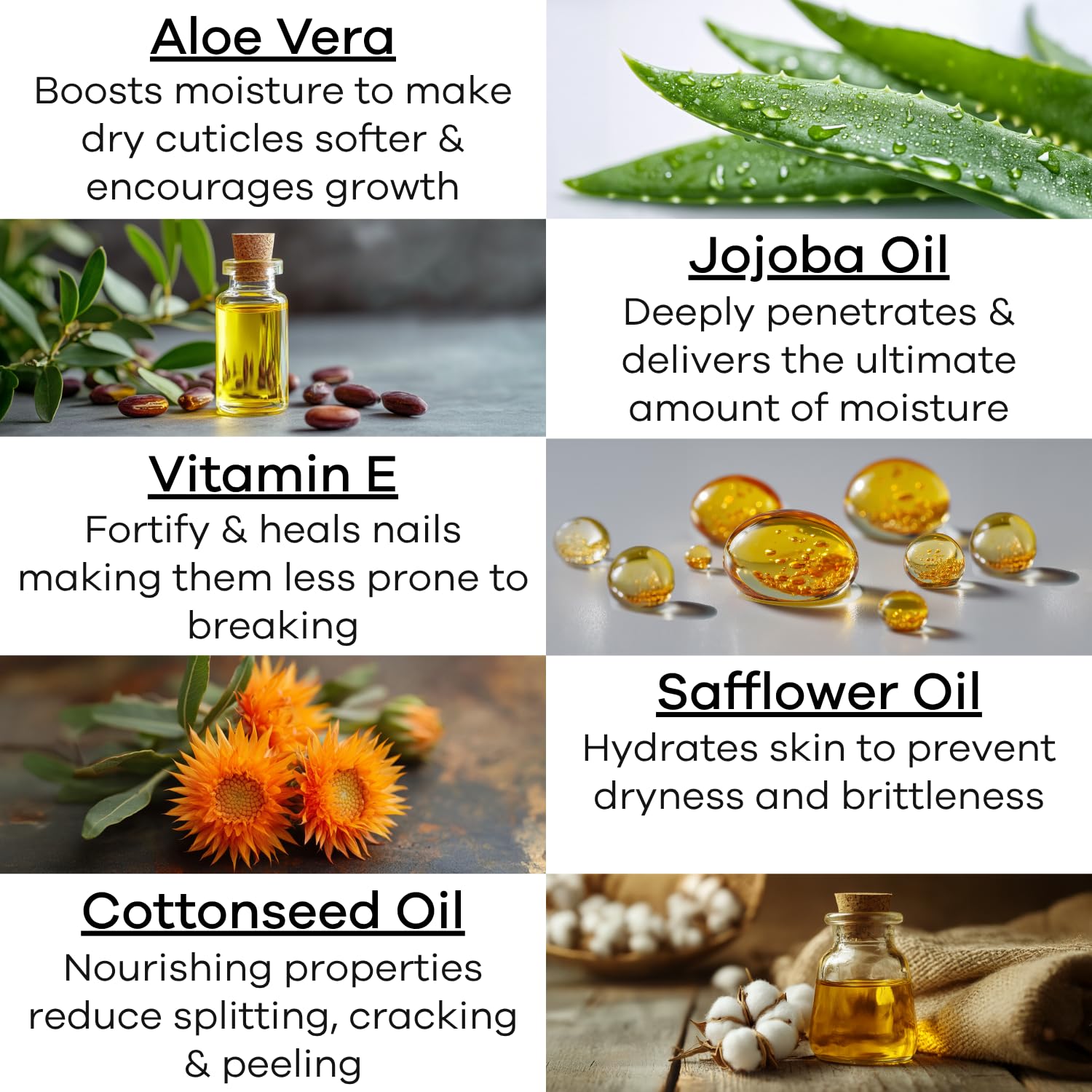 - Our moisturizing treatment oil is blended from high-quality natural oils, vitamins e & aloe. Together these ingredients deeply penetrate the skin to nourish, hydrate, protect & strengthen cuticles & nails so they stay looking healthy. Made in the USA