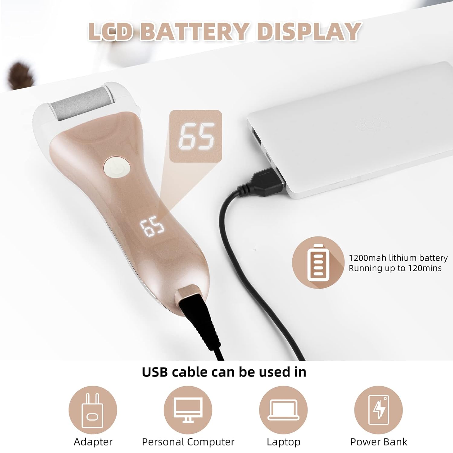 - 【Rechargeable】Large capacity lithium battery can be used up to 120 Minutes. With battery LED display, clearly see how much rest of the power of the battery, and the USB charging time is only for 2-3 hours. Included USB charging cable, the dead skin remover for feet can easy charging with a laptop, power band, socket, and others. Environmental friendly! Say goodbye to AA batteries!