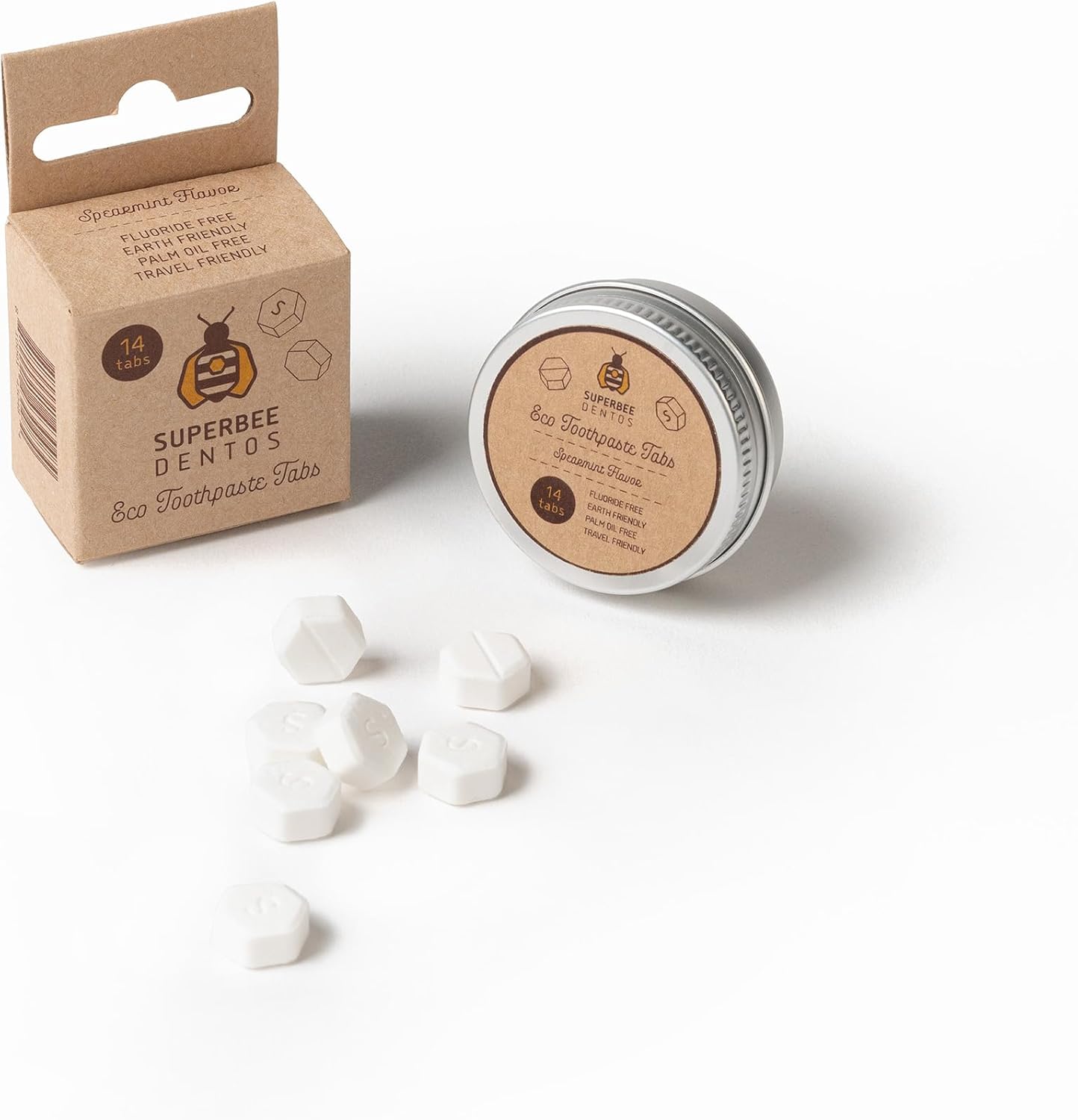 SuperBee Dentos Toothpaste Tablets, 14 Tabs, Fluoride Free & Eco Friendly, Travel Mouthwash Tablets, Sensitive Bites Kids Adults, Chewable Tablet, Spearmint