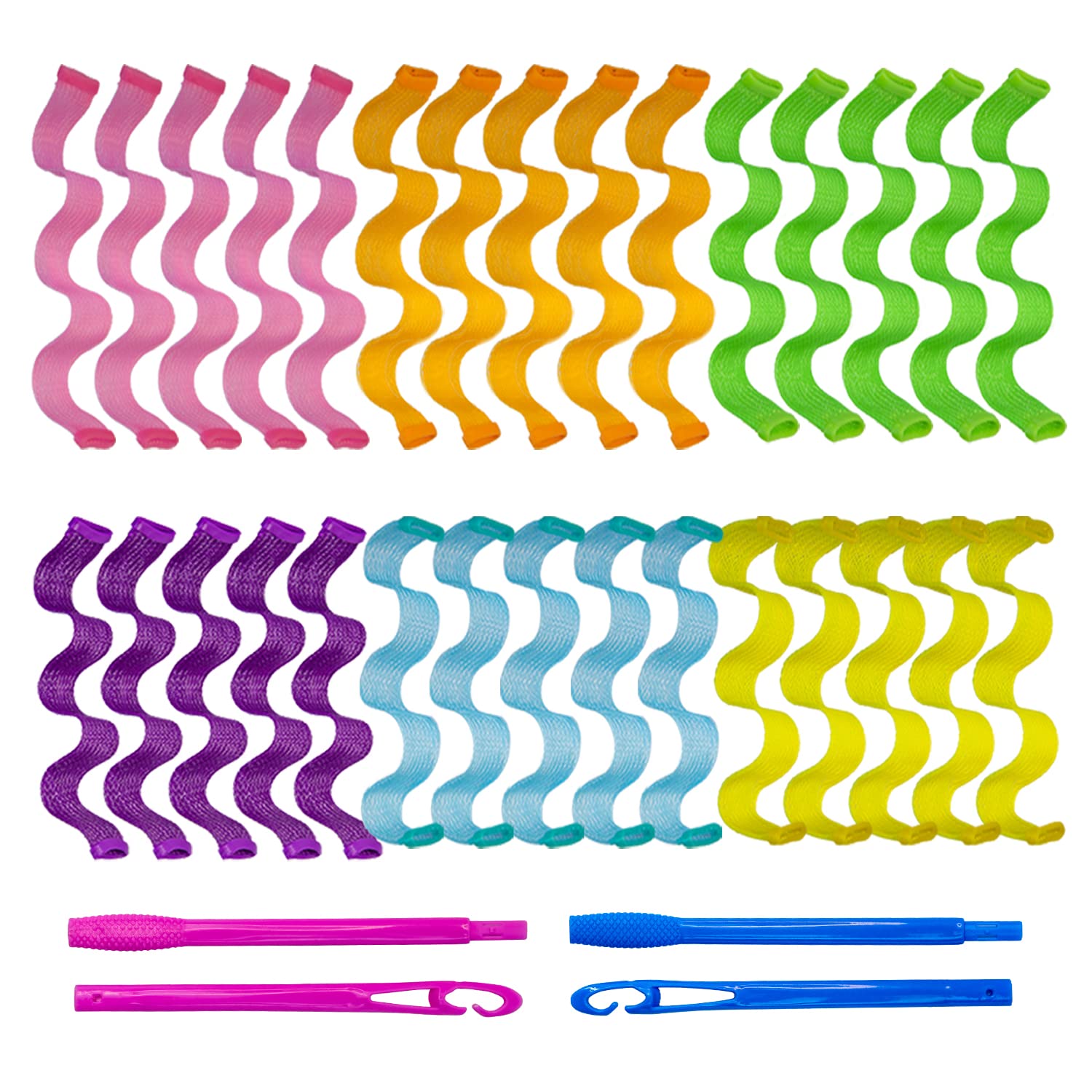 • Package includes: 30pcs wave style hair curlers.pink orange blue green yellow and purple color, 2 sets of hair hooks (blue + pink).