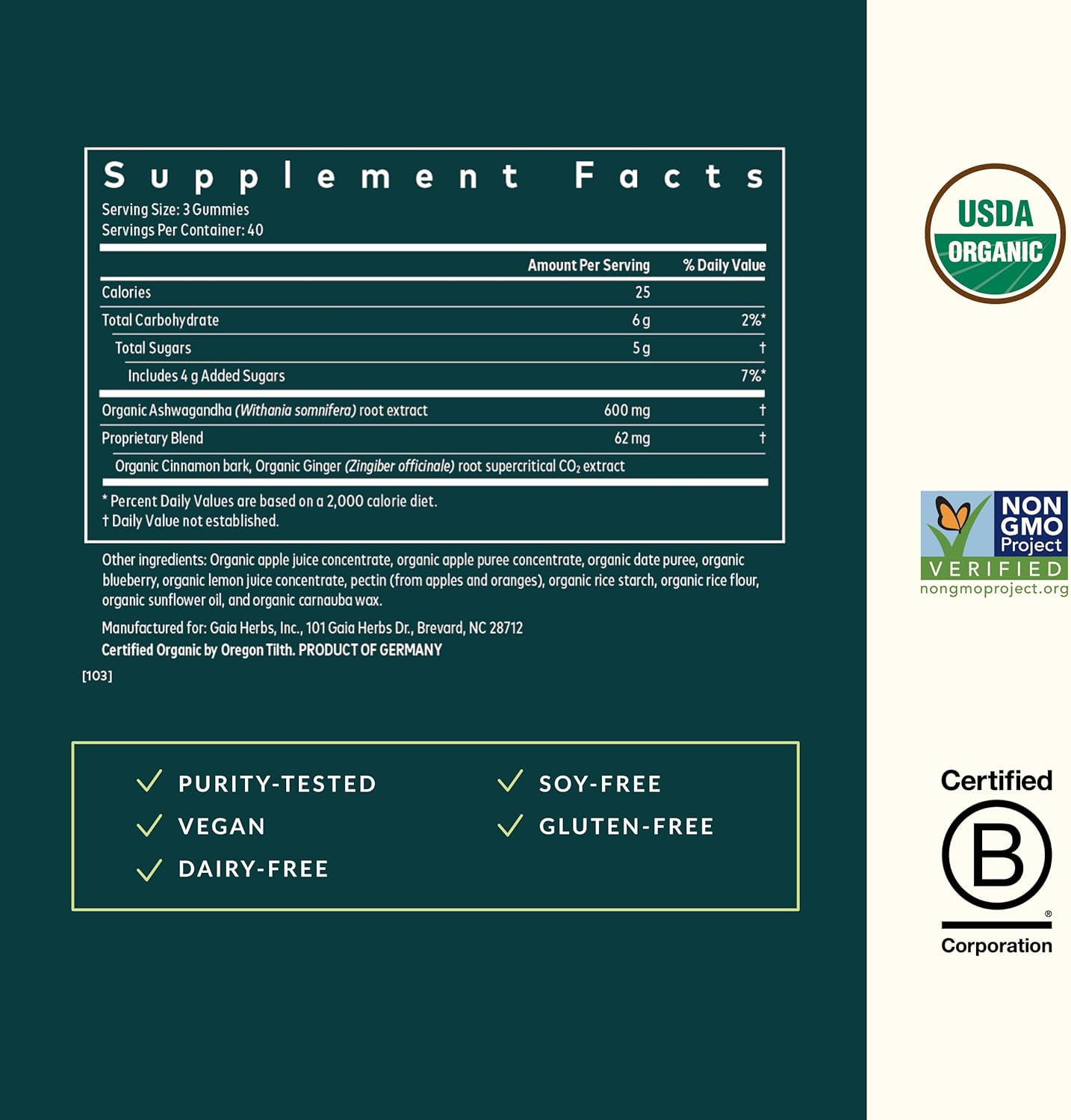 Gaia Herbs Organic Ashwagandha Gummies, Stress Support, Cinnamon, Ginger, Gluten Free, Vegan, 120 Count