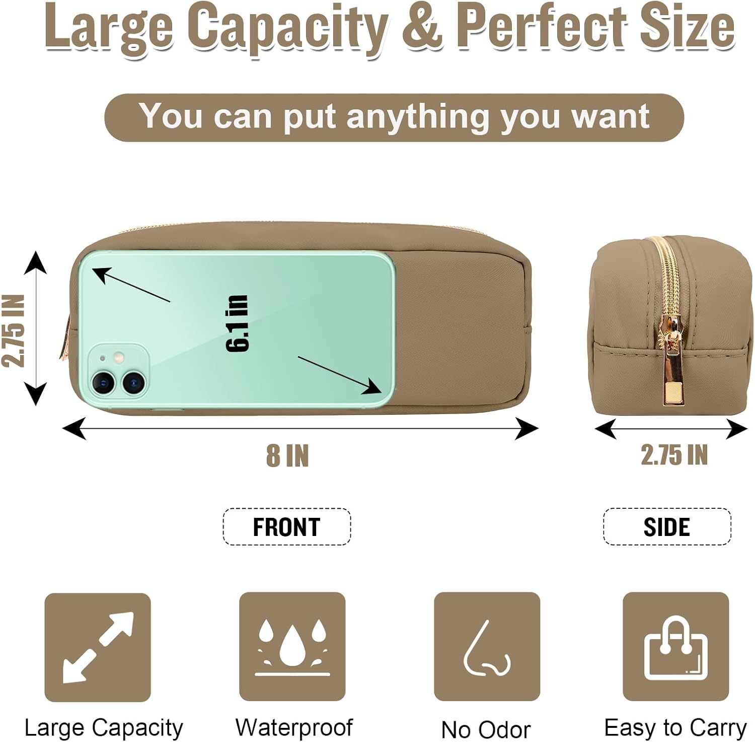 IZUZTA Nylon Slim Makeup Bag, Preppy Cute Makeup Brush Case Bag, Waterproof Travel Toiletry Bag Clutch Coin Pouch Make Up Organizer for Women Girls (Khaki)