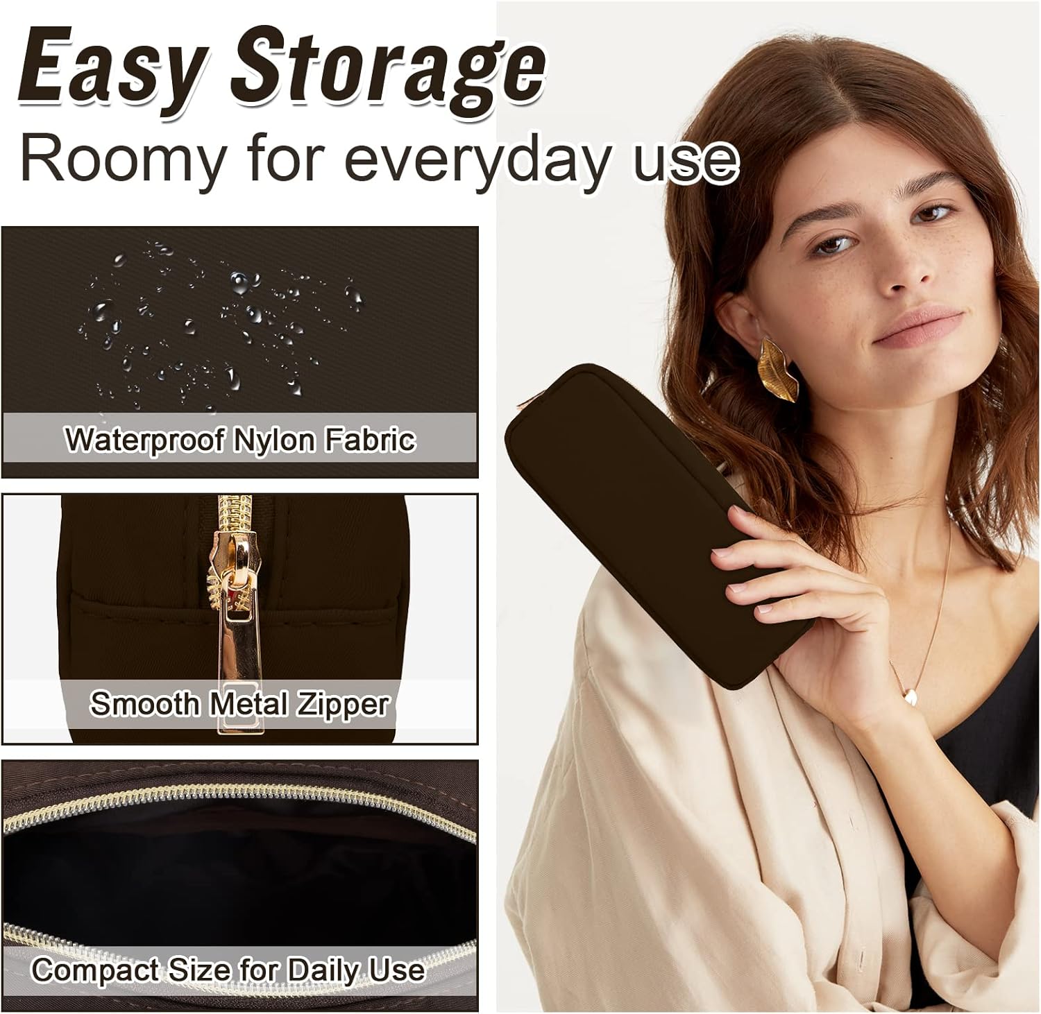 izuzta Nylon Small Makeup Bag Slim Pouch, Preppy Cute Makeup Brush Case Bag Cosmetic Zipper Pouch for Purse, Waterproof Travel Toiletry Bag Clutch Coin Pouch Make Up Organizer for Women(Brown)