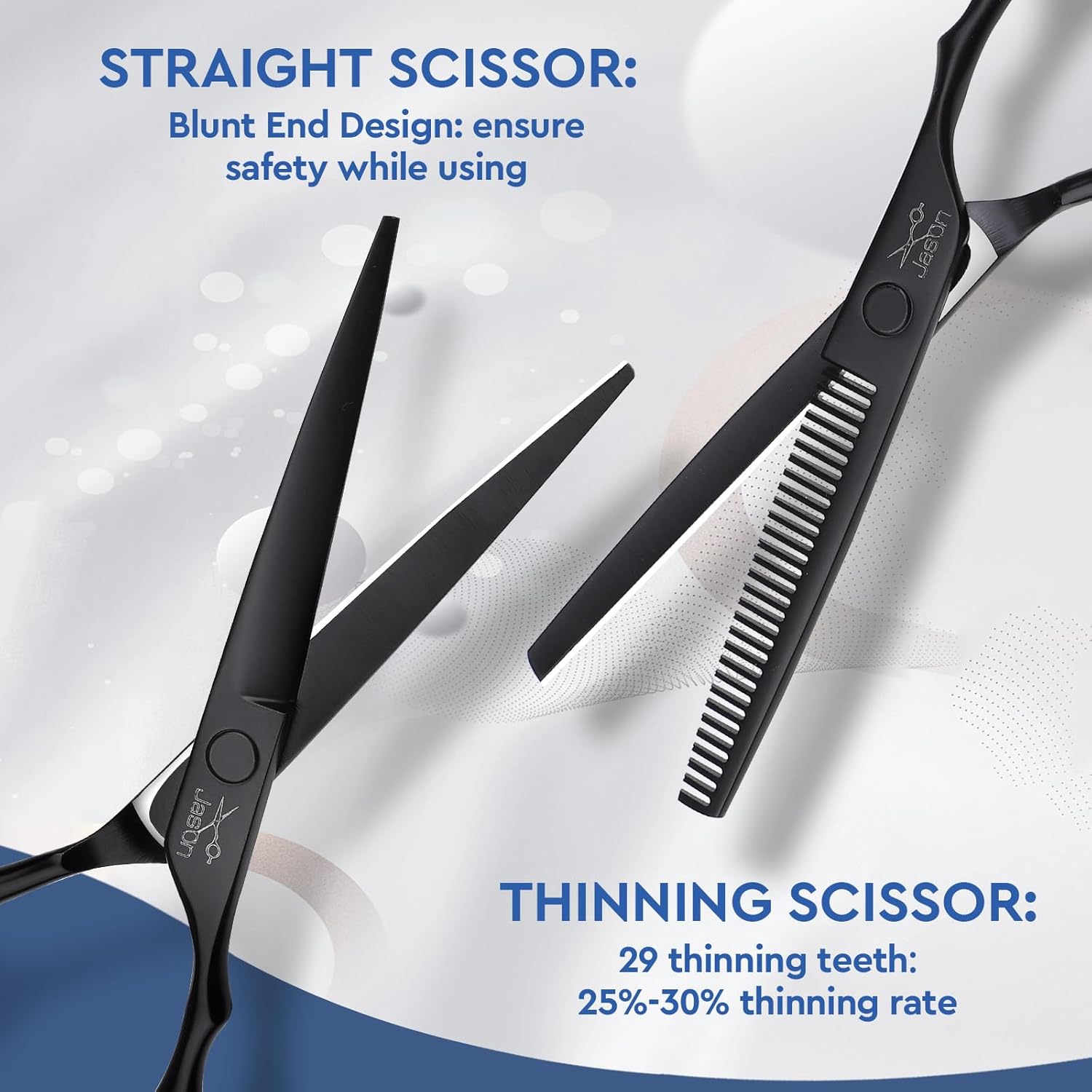 JASON Hair Cutting Scissors Set - Professional 10 PCS Haircut Scissors kit, Thinning Blender Scissors, Straight Shears with 30 Teeth for Men Women Home Salon Barber (6.5", Black)