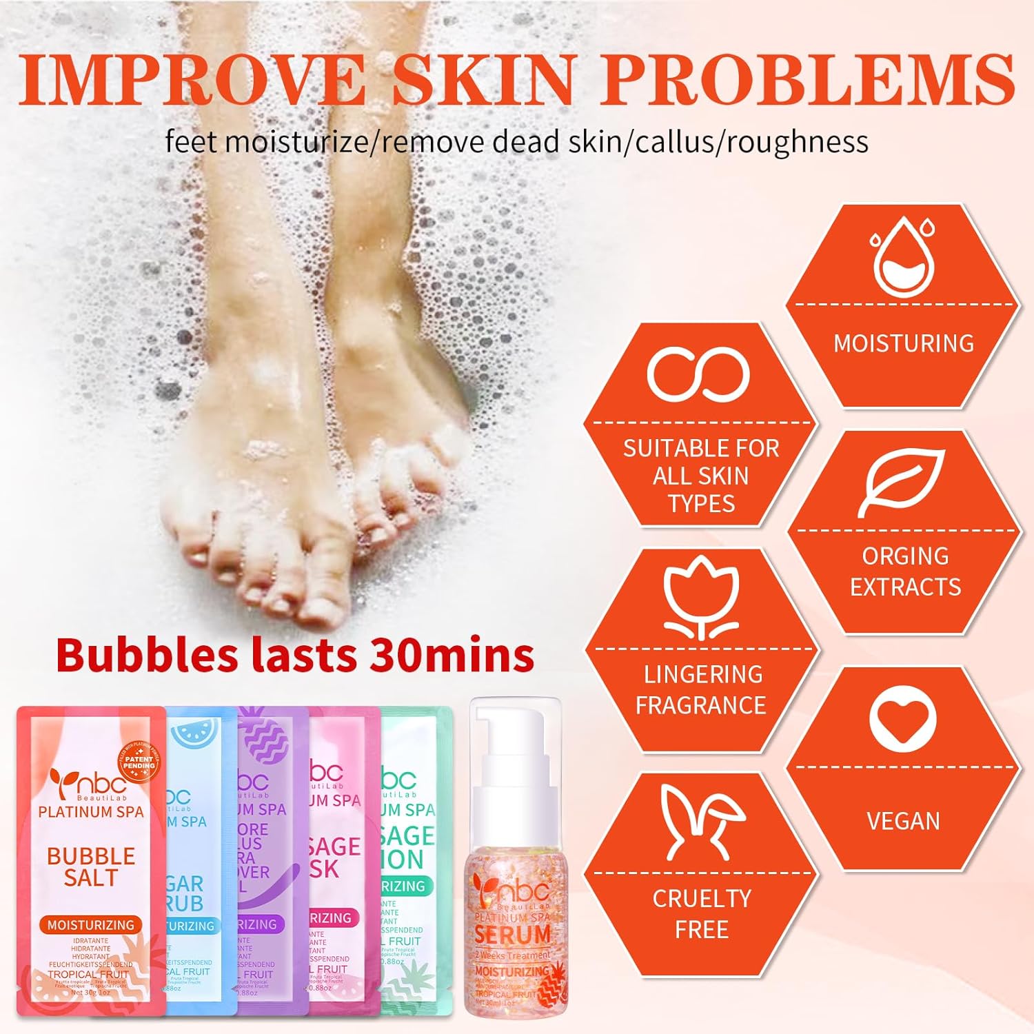 - π£[Upgraded Foot Spa] This 6 in 1 newly upgraded bubble foot soak is guaranteed to effectively remove your stubborn calluses, and relieve your feet of fatigue and pain. It can help soothe itchy feet and remove odors. Using this pedicure kit is guaranteed to restore your feet to feeling smooth and moisturized as soon as possible.