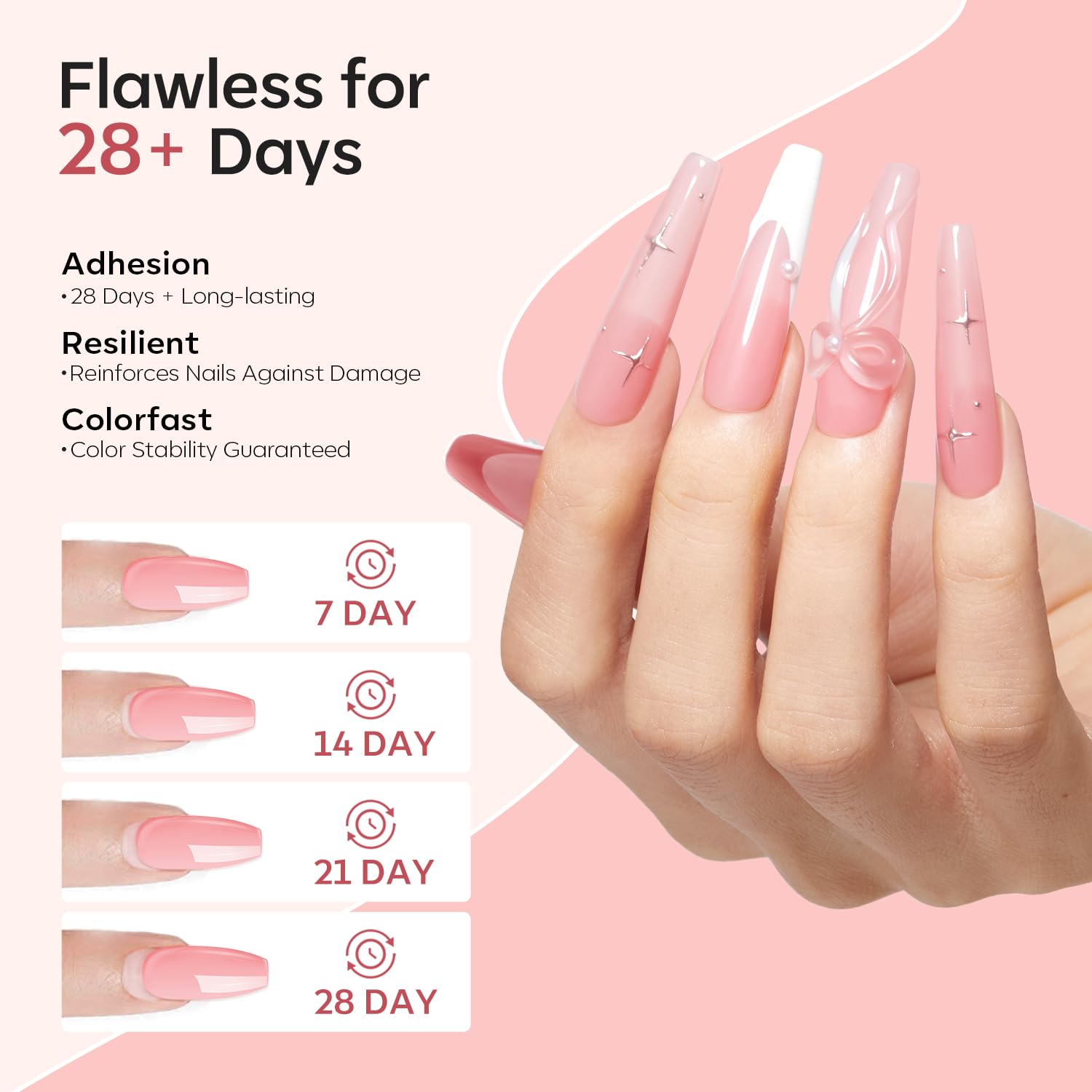 - Upgraded Non-Yellowing Formula​​: Enhanced ​​clear acrylic powder​​ base resists discoloration for 180+ days. ​​Self-leveling technology​​ ensures bubble-free, glossy finish