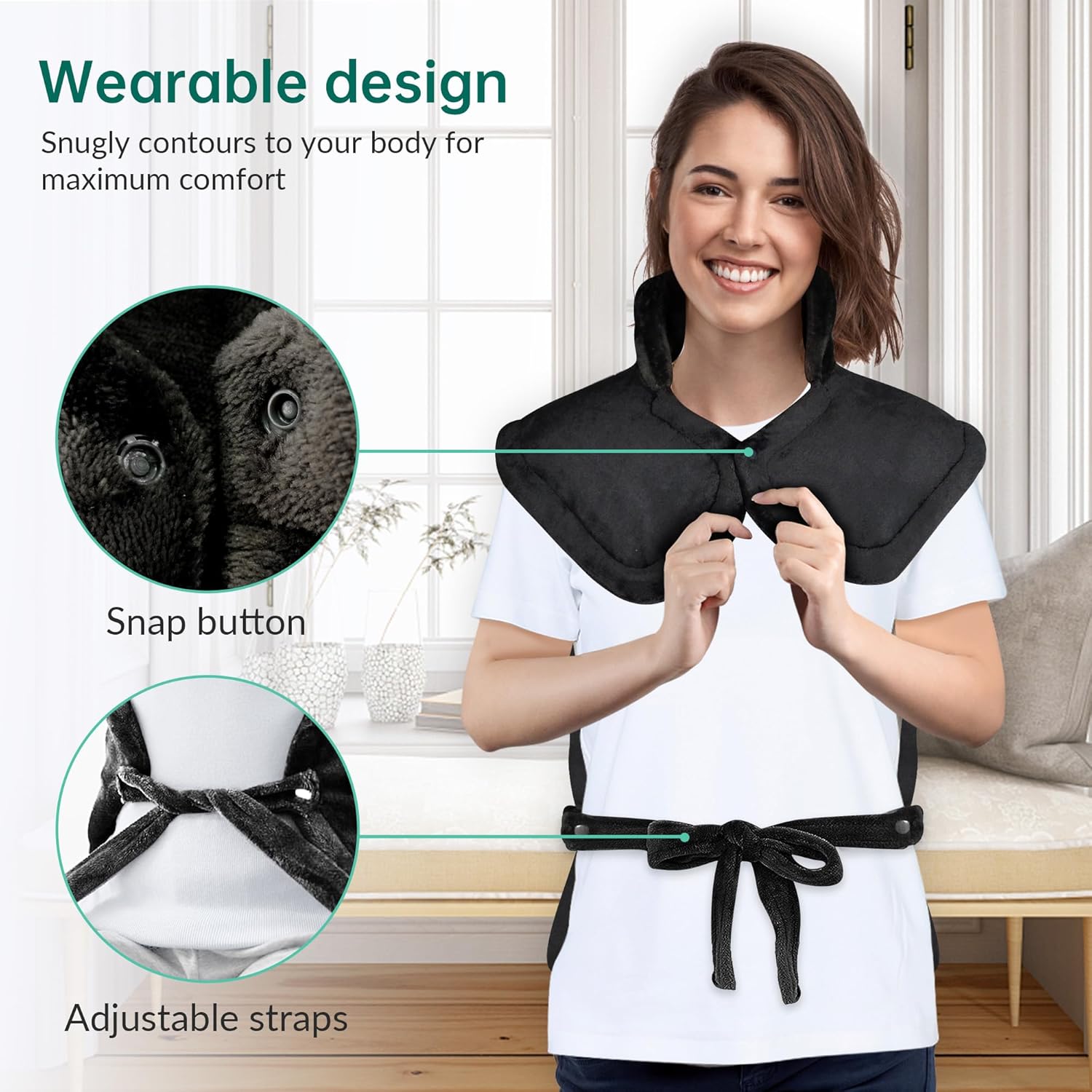 - Neck Warmer Large size full Coverage: 24" x 33" Snailax wearable large heating pad is designed with a high collar and widened shoulders for full coverage of the neck and shoulders,back,waist. XL heating pad provides soothing heat to warm your body.