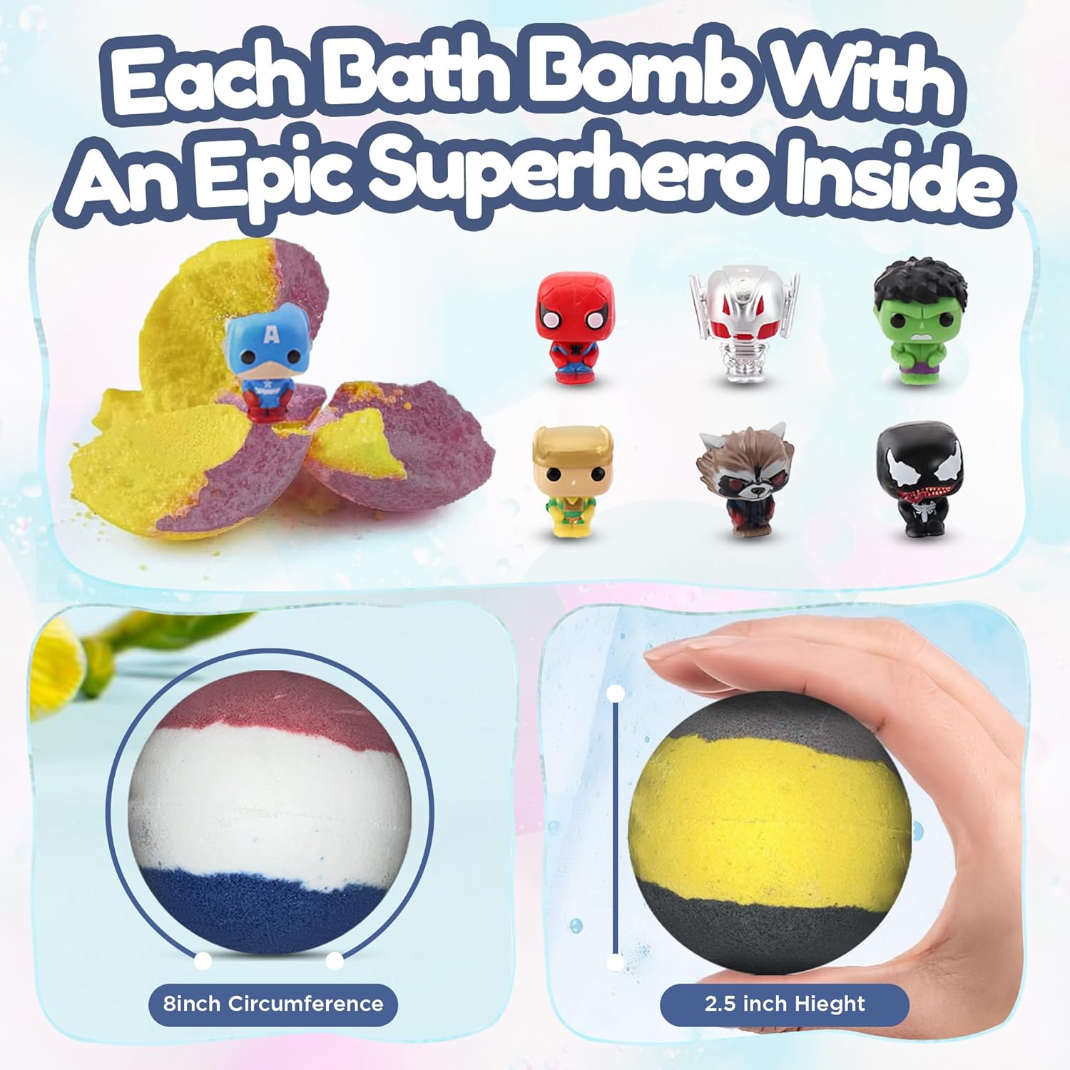 - Kids Bath Bombs for Boys with Surprise - Our non toxic kids bath bombs are designed to be safe & fun. Our superhero bath bombs for boys with toys hidden inside make the best superhero gift. Kids love discovering an epic super hero character bath toy is found in each fizzy bathbomb.