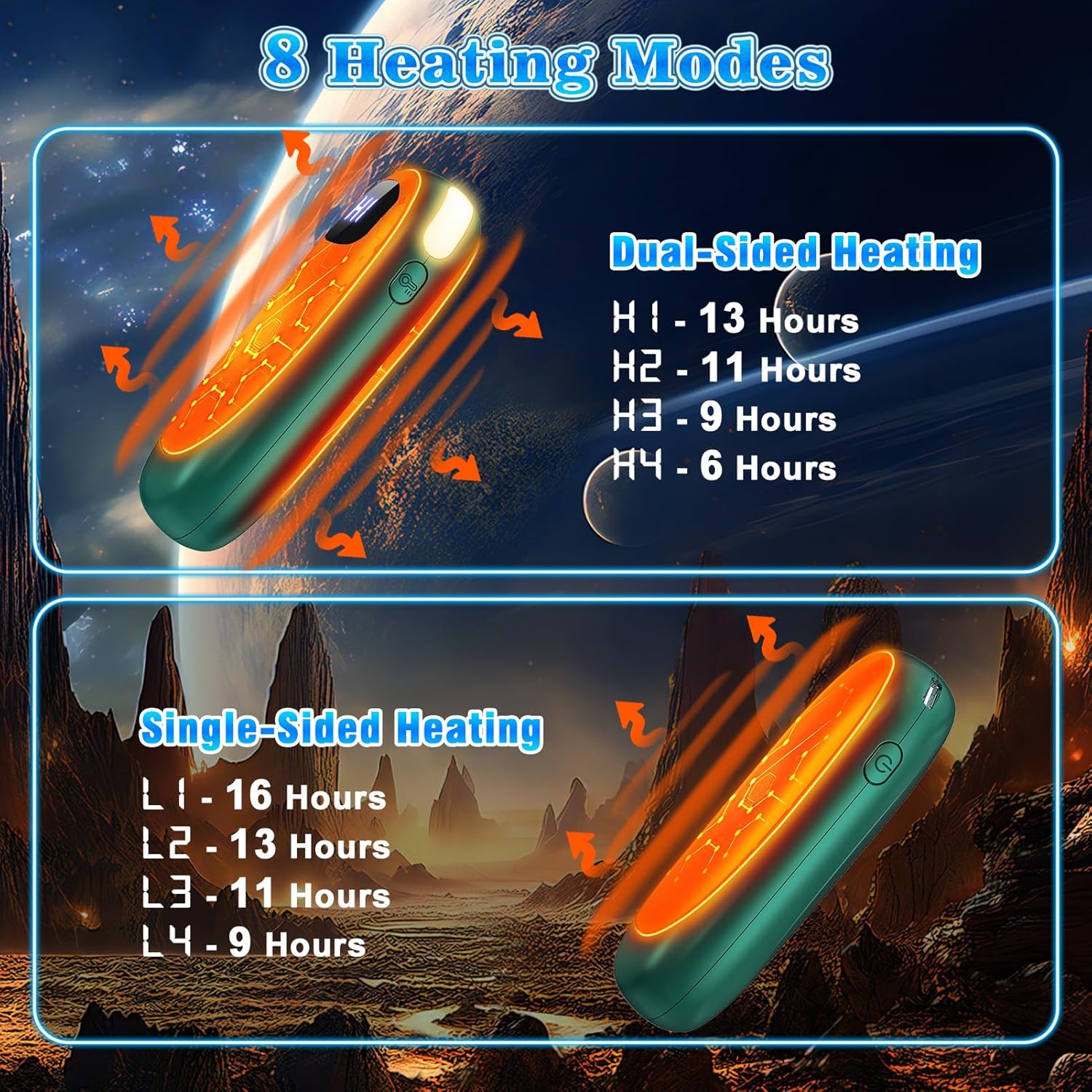 - 【4 Heat Levels & 8 Heating Modes】Experience our electric hand warmers rechargeable with 4 adjustable levels for both single-side and dual-side heating, providing a total of 8 heating modes. Whether you're facing chilly outdoor adventures or just need a little extra warmth during everyday activities, our electric hand warmer is the perfect companion, offering a customized heating experience at your fingertips