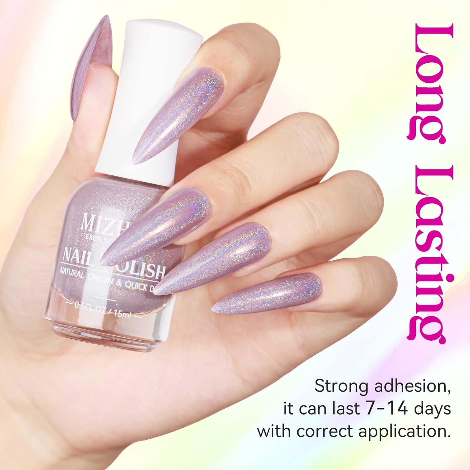 - MIZHSE Holographic Nail Polish: 1 x 15 ml (0.5 fl oz) holographic nail polish. The nail polish is high pigmented that makes the nails shine like rainbow. Can get different holographic rainbow effects based on different lights and viewing angles. Professional nail polish for infinite styles. Iridescent nail polish is suitable for use with any color nail polish you like as base color.