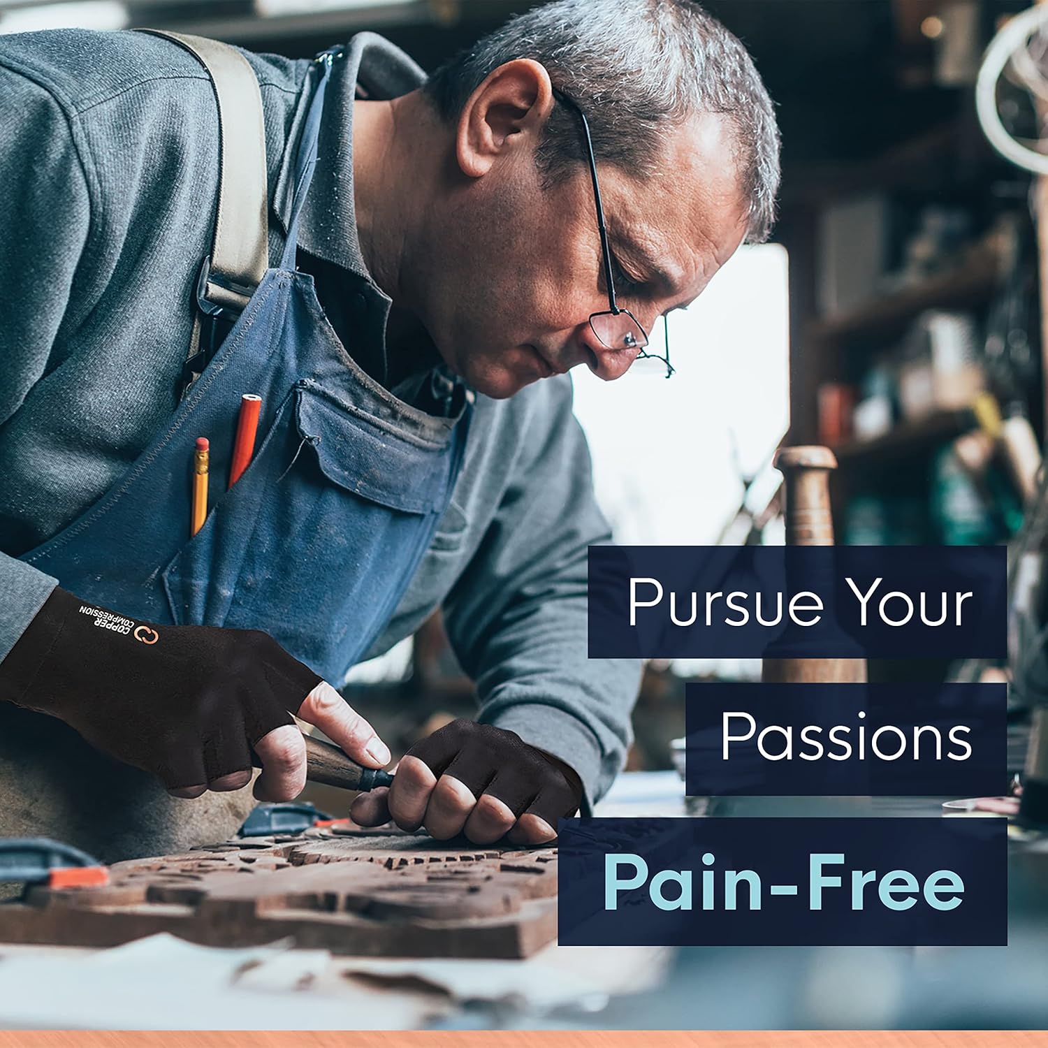 - FIND THE STRENGTH TO HEAL. Copper Compression's Arthritis Gloves provide you with the compression you need to help reduce swelling and pressure, increase blood flow, restrict excess fluid build-up, and relieve aching and soreness in joints. The therapeutic value of these fingerless gloves provides support in managing medical conditions such as: arthritis, carpal tunnel, tendonitis, typing, texting, purlicue pain and repetitive stress injuries.
