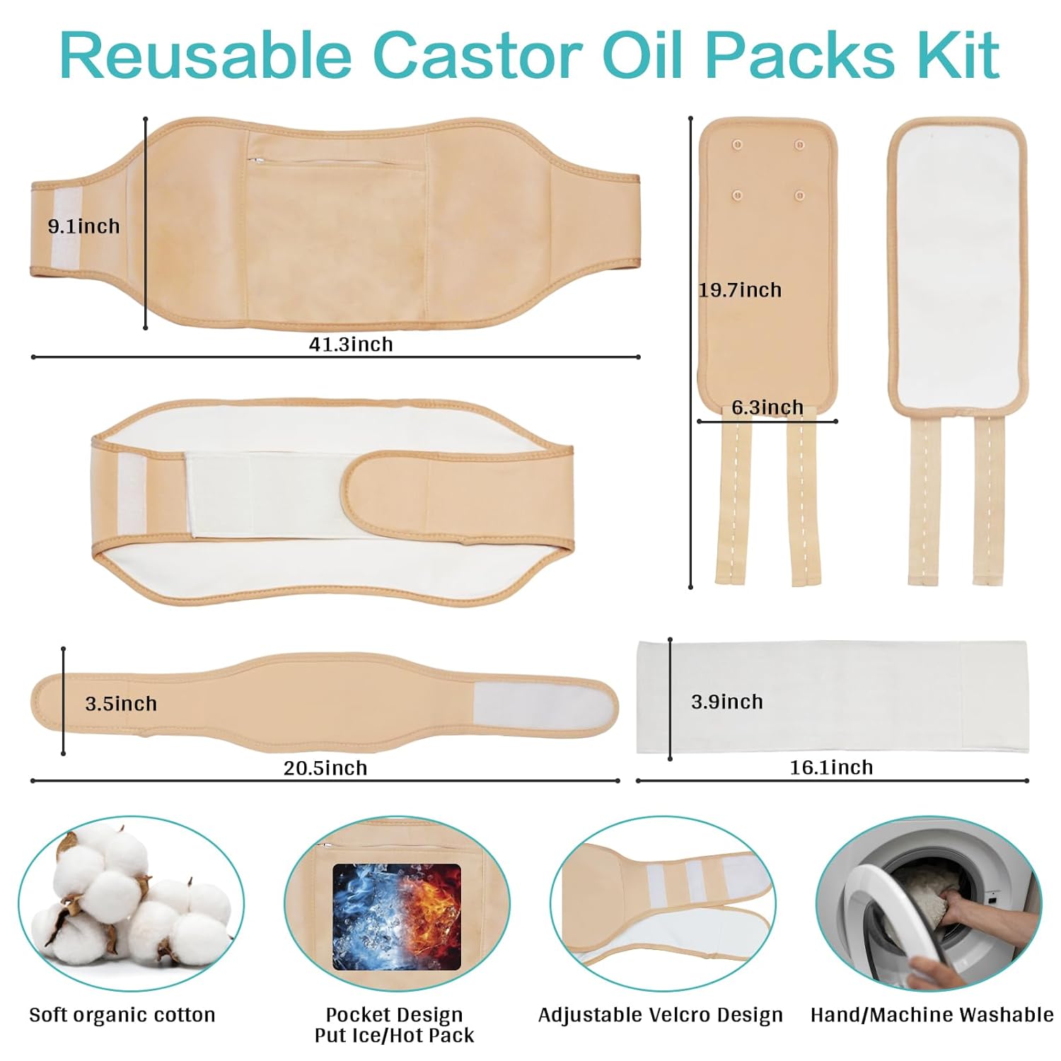 - Castor Oil Wrap Kit: The package have 5 pcs sets and include 2 pcs knee castor oil packs, 1 pcs waist castor oil packs, 1 pcs neck castor oil wrap, and 1 pcs extension belt. One castor oil packs kit can cater to different body parts, you can use them on the arms, knee, legs, stomach, belly, waist, relaxing the entire body (Castor Oil Not Include).