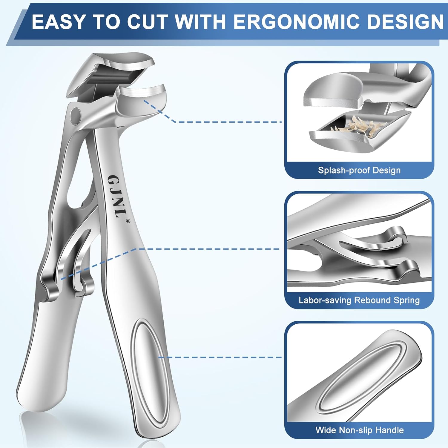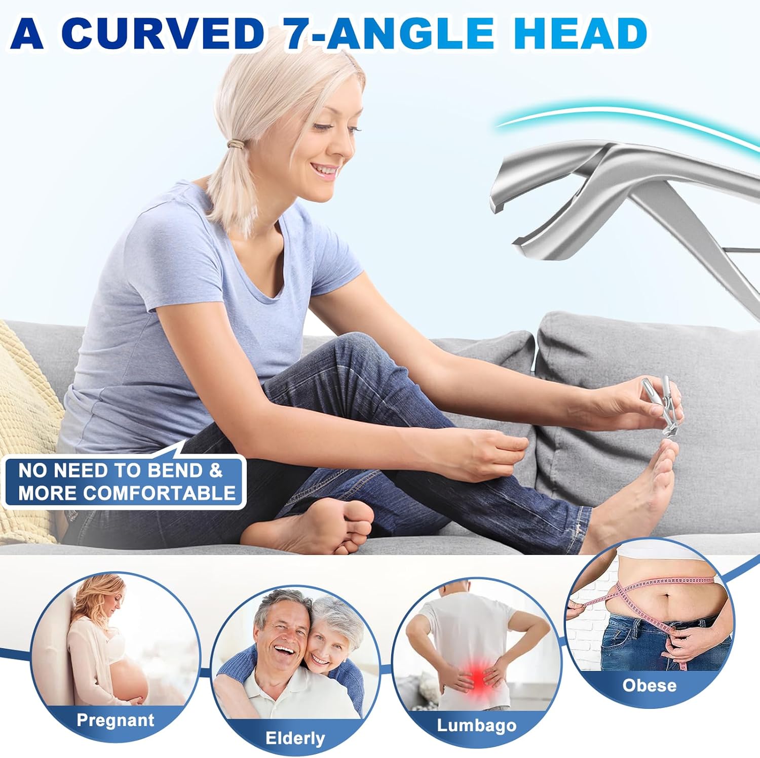 - 【Angled Head Toenail Clipper for Easier Trimming】The nail clipper adopts an ergonomic design with a curved 7-angle head, which allows you to clearly see the edge of the blade and the nails, so that you can cut nails accurately and confidently, no longer need to twist and bend your body when cutting toenails. The newly upgraded nail clippers with a catcher feature a splash-proof design and a wide Jaw curved blade that can open up to 12 mm, enough to trim any thick nails