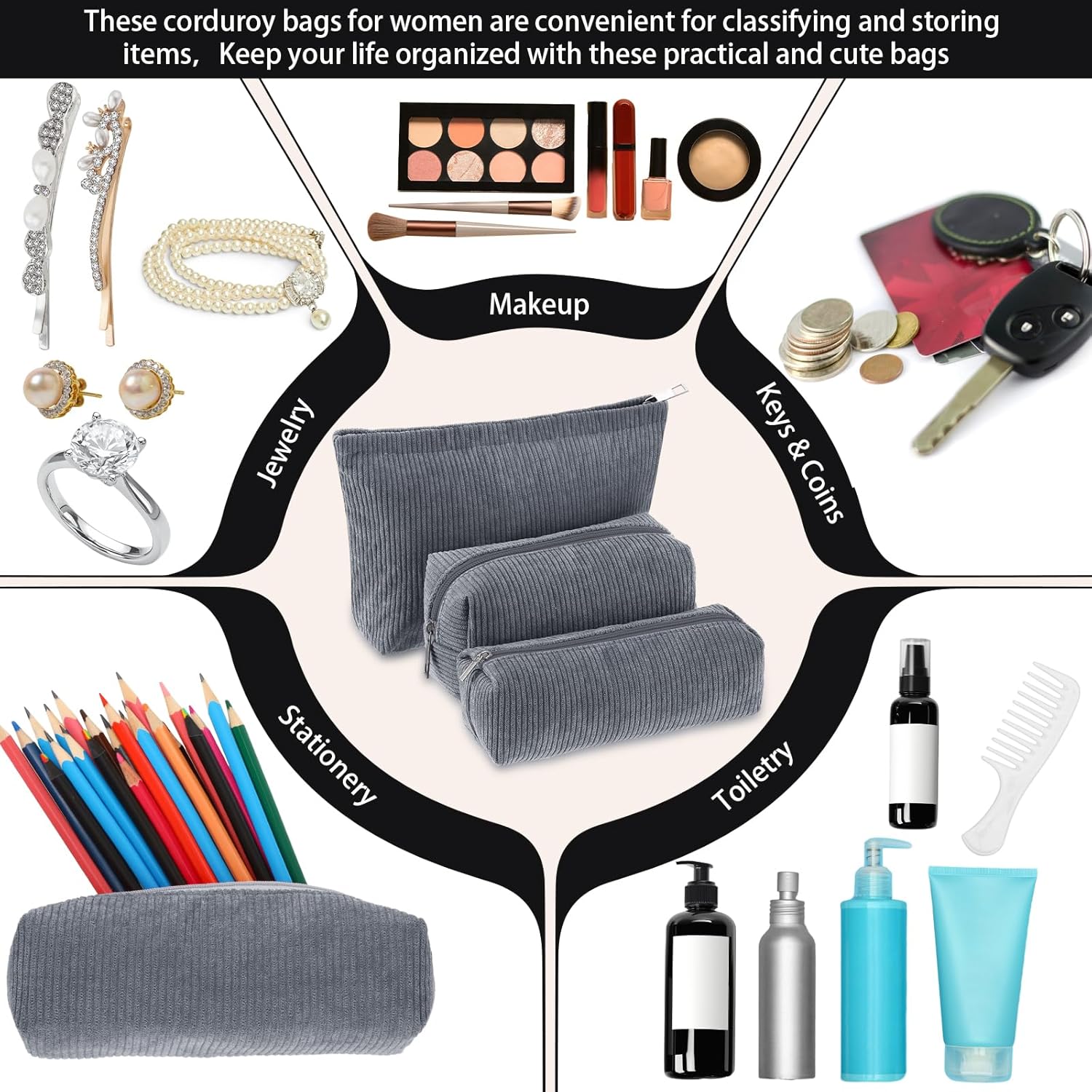 - Material and Attractive Design: the makeup and toiletry travel bag set is mainly crafted from quality corduroy material, ensuring high durability and prolonged service life; The bags feature a vibrant gray color surface, makes them compatible with various styles of outfits