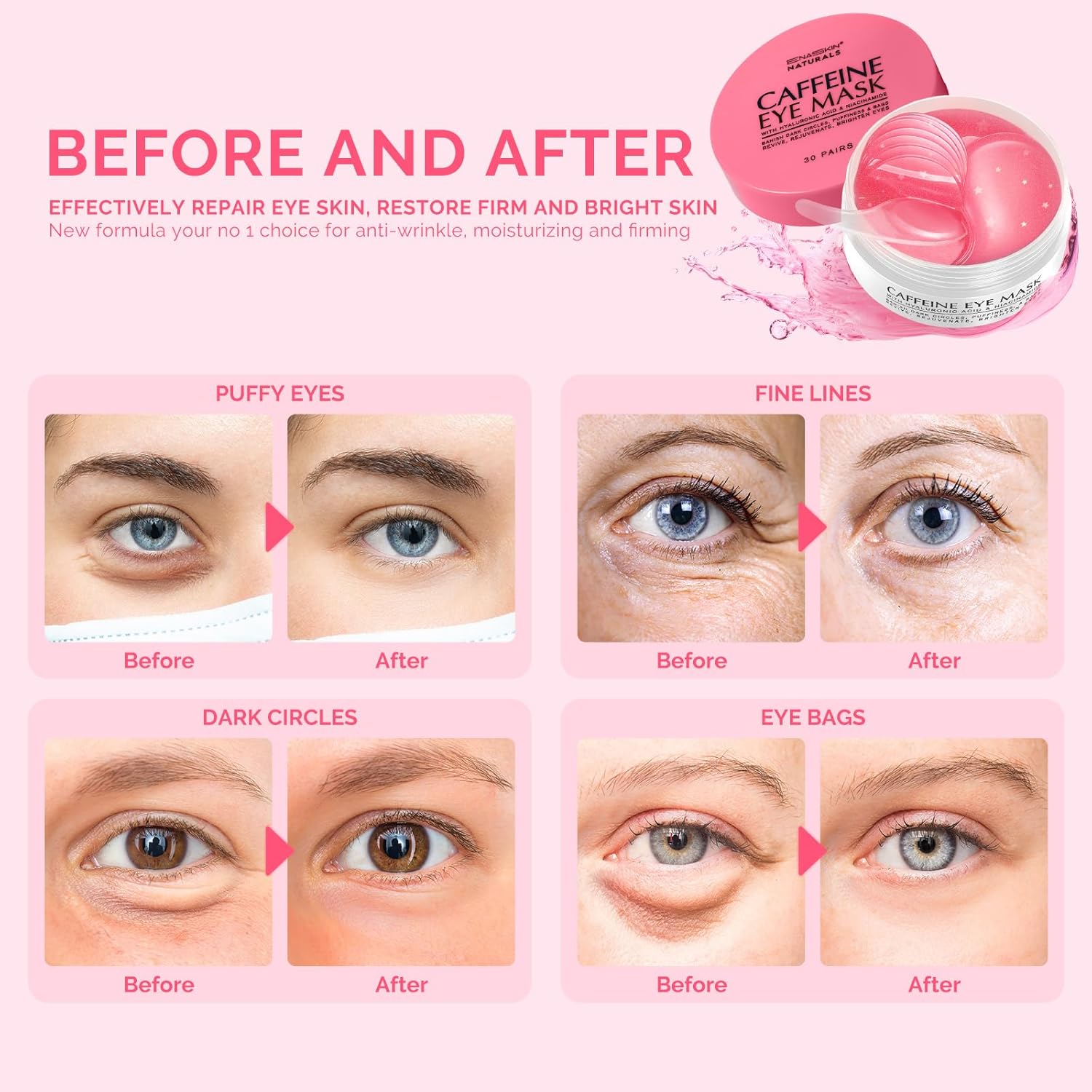 - Revitalizing Caffeine Complex: Our Caffeine Brightening Eye Masks are enriched with a potent blend of caffeine, hyaluronic acid, and collagen. This unique combination works effectively to reduce dark circles and puffiness, rejuvenating tired eyes. Suitable for all skin types, these masks are a perfect addition to your morning routine to help you look refreshed and awake.