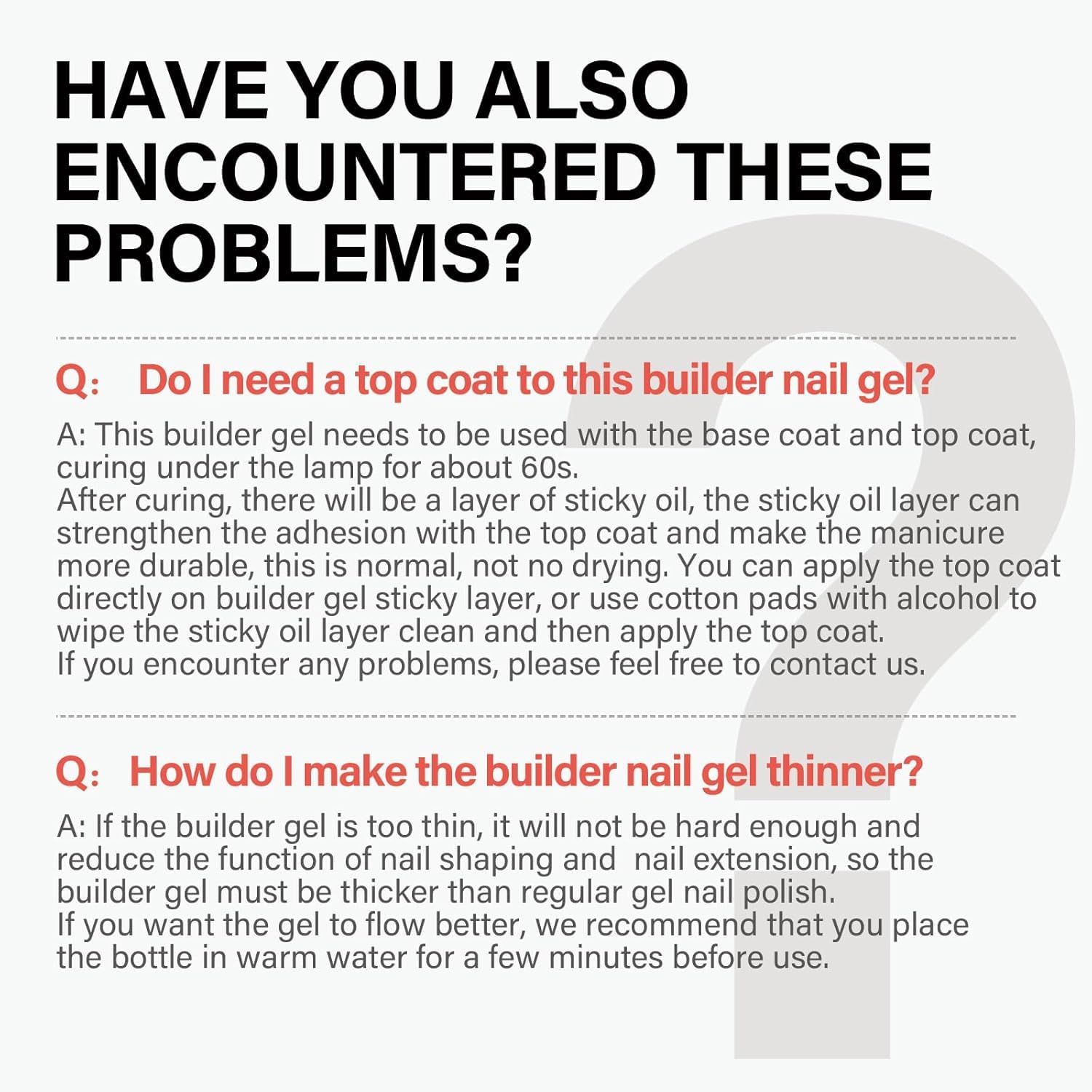 - Please Note: This nail builder gel needs to be used with the base coat and top coat, curing under the lamp for about 60s. After curing, there will be a layer of sticky oil, the sticky oil layer can strengthen the adhesion with the top coat and make the manicure more durable. You don't need to touch and wipe with your hands or alcohol pads, just apply the top coat directly on builder gel layer and continue curing. If you encounter any problems, please feel free to contact us.