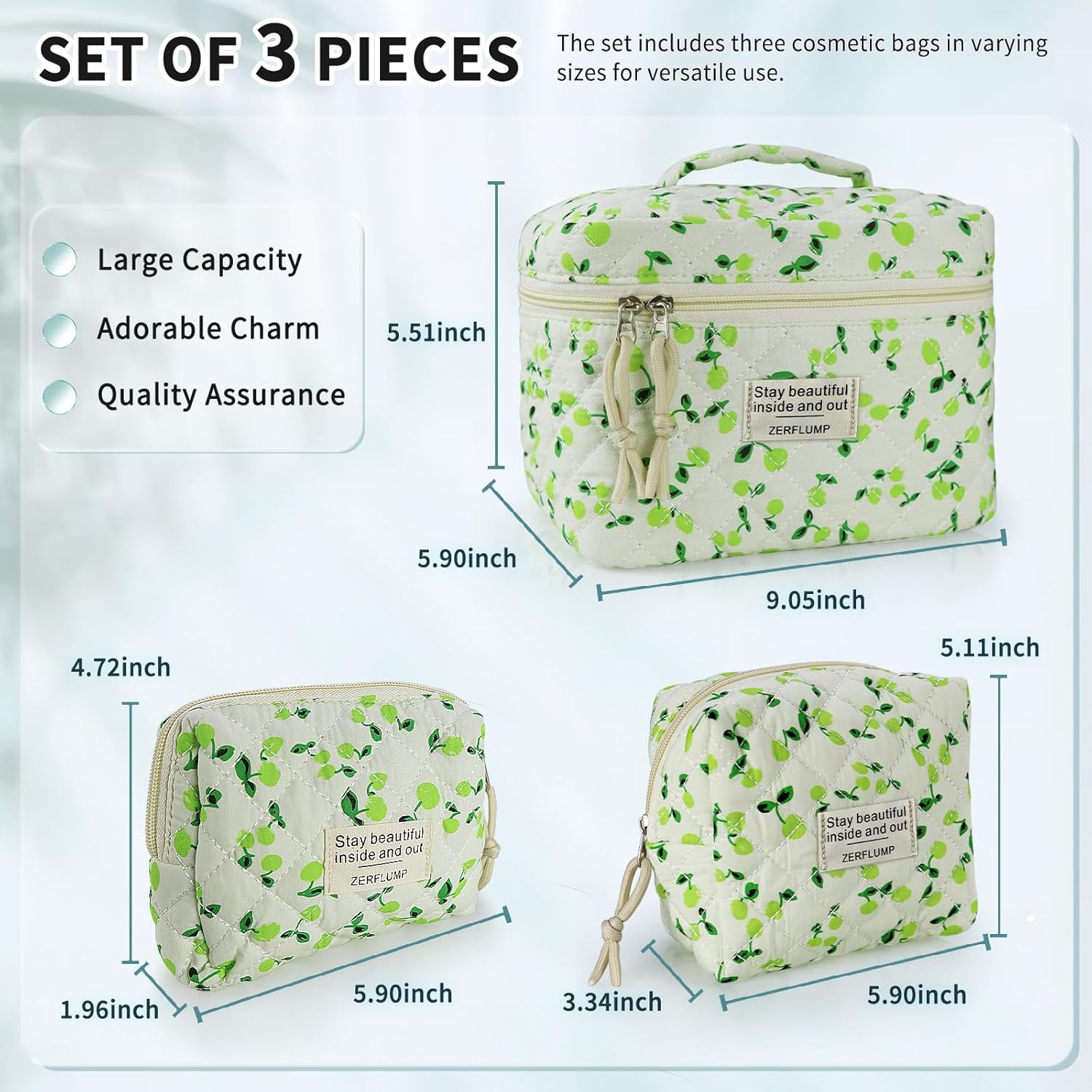 - Set of 3 Pieces: The set includes three cosmetic bags in varying sizes for versatile use. . The large size measures 9.05 x 5.9 x 5.51 inches, the medium size is about 5.90 x 3.34 x 5.11 inches, and the small size is around 5.90x 1.96 x 4.72 inches.
