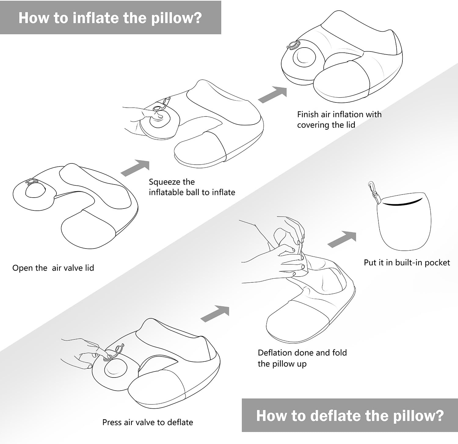 - FASTER INFLATION SPEED: The inflatable travel pillow adopts the most latest invention of push botton inflation is quickly inflated and deflated, press the valve to select your cushion preference. To deflate, simply push the valve to release all the air, roll and easily pack away