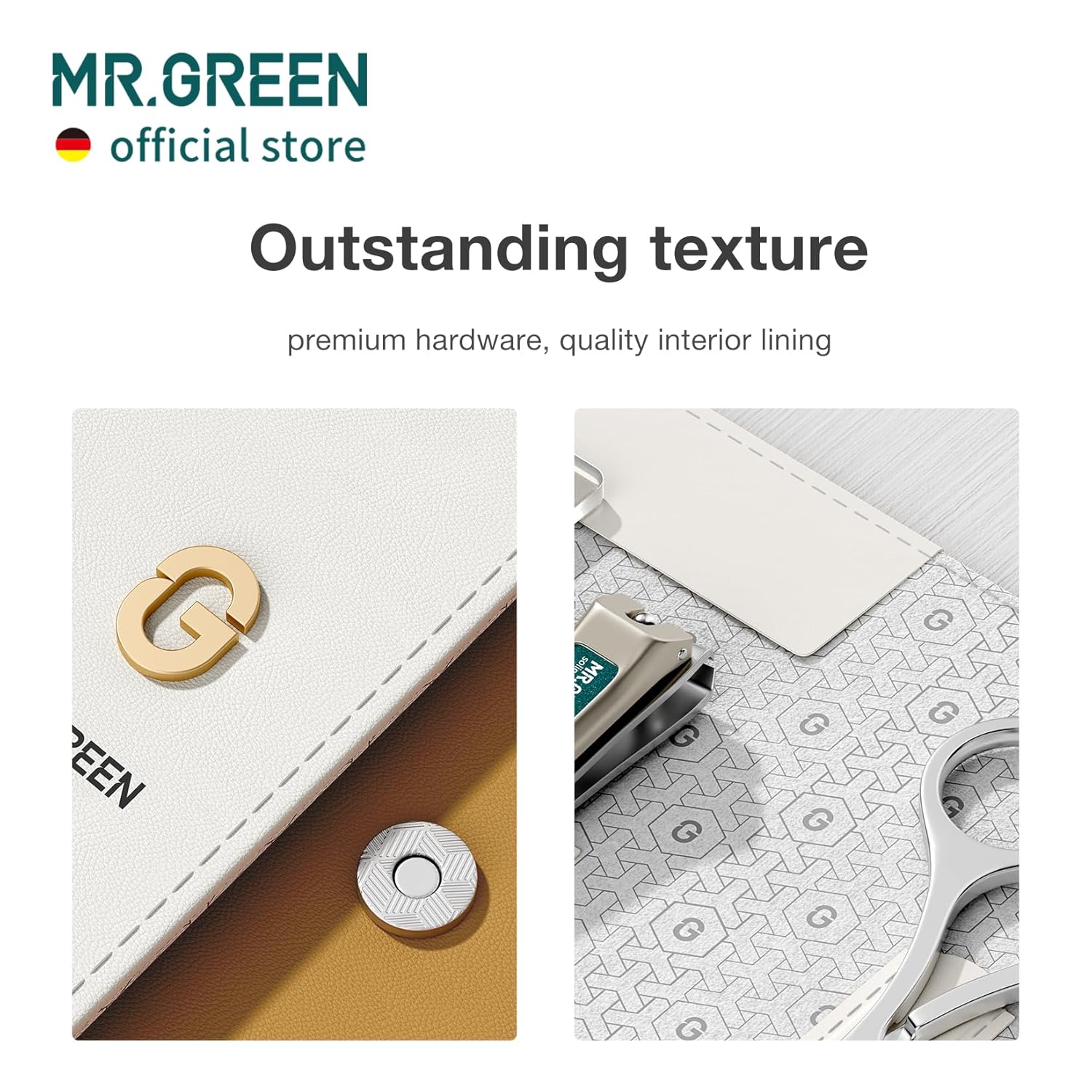 - The leather cases of the nail care kits are made of high-grade PU leather, featuring a stylish contrasting color design complemented by the premium G logo, resembling a piece of art filled with a sense of sophistication.