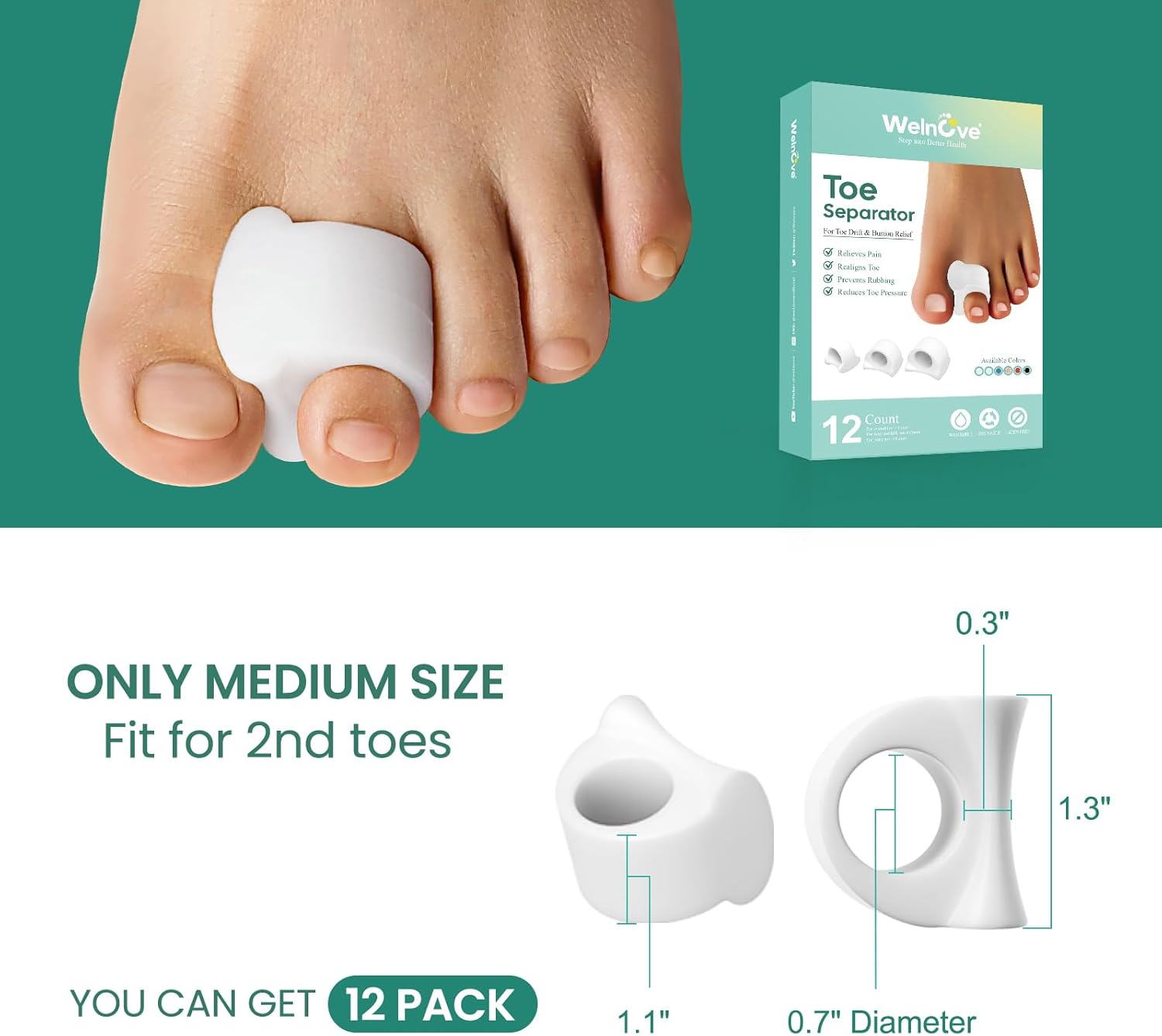 - What You Get: We offer our bunion toe spacer 12-pack medium size, so you can find the perfect fit for your toes. Our toe separators are suitable for both men and women, and they're comfy and effective for anyone who needs relief from foot pain.