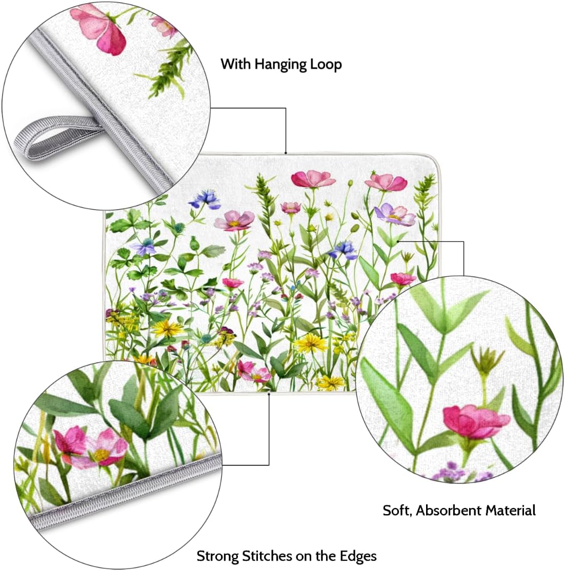 Hexteria Colorful Flowers Large Dish Drying Mats for Kitchen Counter 18 X 24 Inch Spring Floral Microfiber Dish Mat, Dish Drainer Mats for Countertops, Wildflower