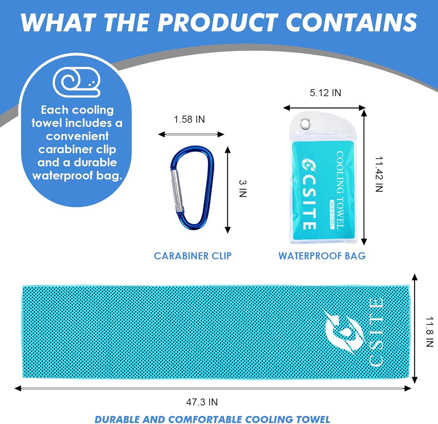 - DESIGN FEATURE & CUSTOMER SERVICE: Cooling towels measure 47"x12" with an extended length designed to adequately cover the neck and face. If you have any problems with your cooling towels, please email us and we will answer your questions quickly and patiently