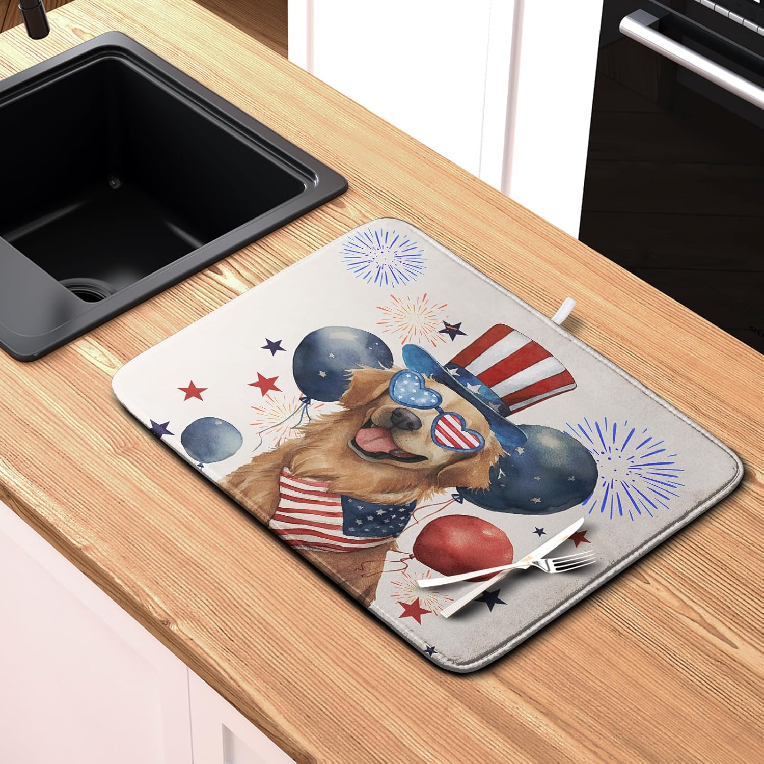4th of July Patriotic Dog Dish Drying Mat 18 x 24 Inch US Independence Day Blue White Red Kitchen Drying Mat Firework Holiday Dish Drainer Mats Super Absorbent Dish Rack Pad for Kitchen Counter